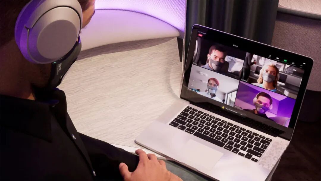 该面罩旨在与手机、通话或视频会议软件以及苹果 AirPods 等蓝牙耳机兼容。