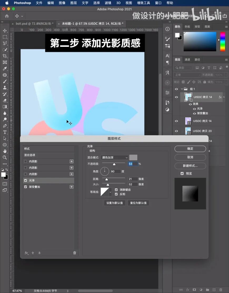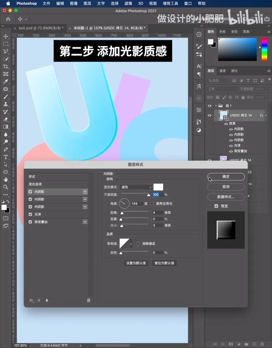 通过图层样式,给文字依次添加渐变叠加、光泽和三层内阴影的效果,模拟玻璃的光影质感及厚度。(具体参数见下图,可根据文字大小做调整)