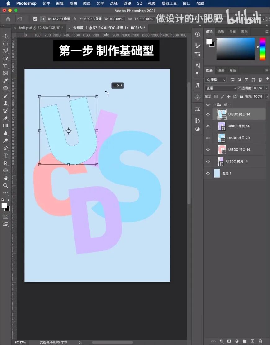 输入文字并转为形状,选择合适的颜色并调整大小、角度,完成对文字基础型的排版设计。