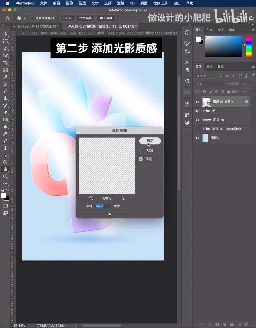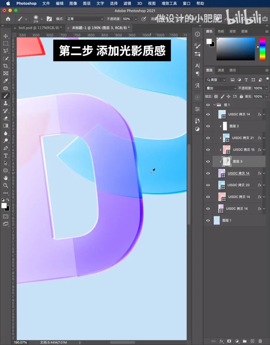 将被遮挡住的文字复制一层,以剪贴蒙版的形式添加到目标图层上方,降低透明度来模拟玻璃半透明材质,还可以添加羽化效果模拟毛玻璃质感。