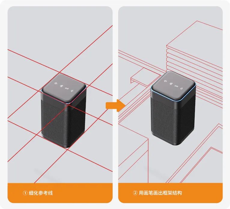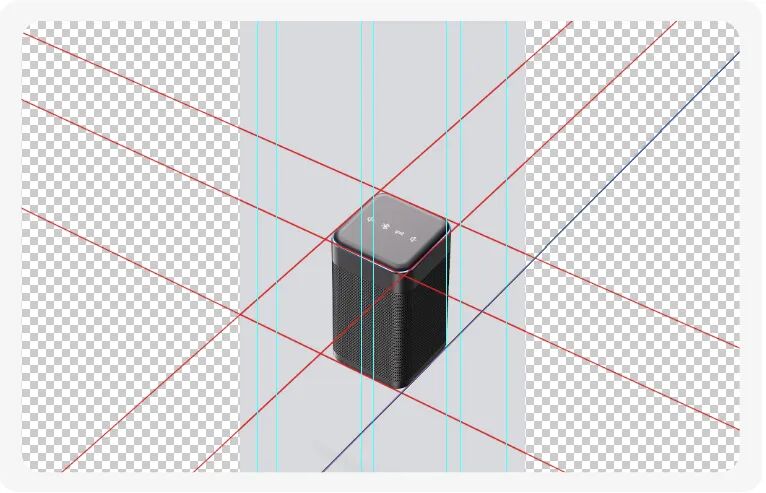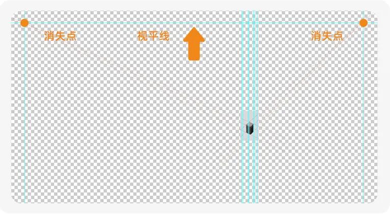 01.首先根据产品在画布中的透视,用画笔画出两点透视线,然后确定场景的分布情况