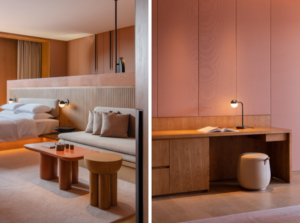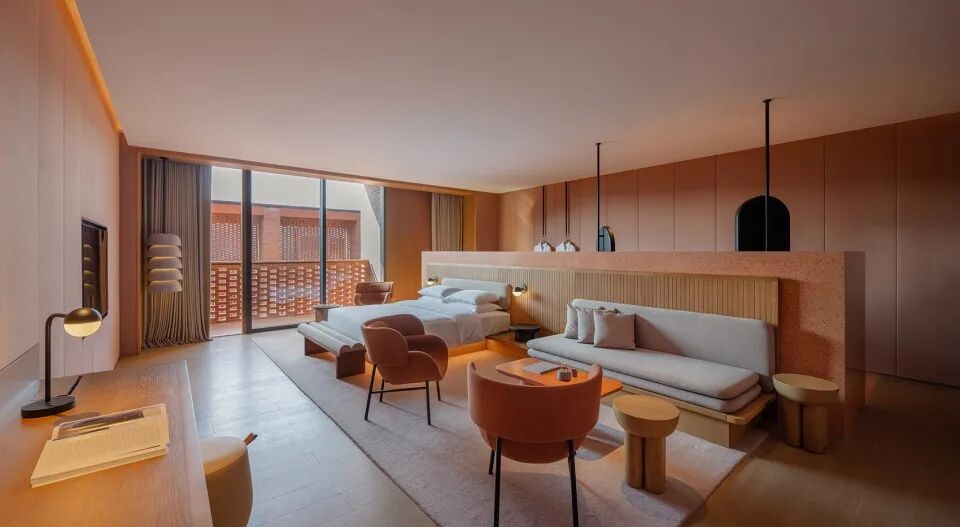 客房区更加微妙踏实。被称为工作室的地方,是回归、隐居和养精蓄锐之处。客人在无釉、似工作室般的质朴纹理的长凳和衣架间休息着,恢复精神。粘土色调主导着空间,特别的帆布墙面肌理则创造了客人与材料相遇和独处的机会。