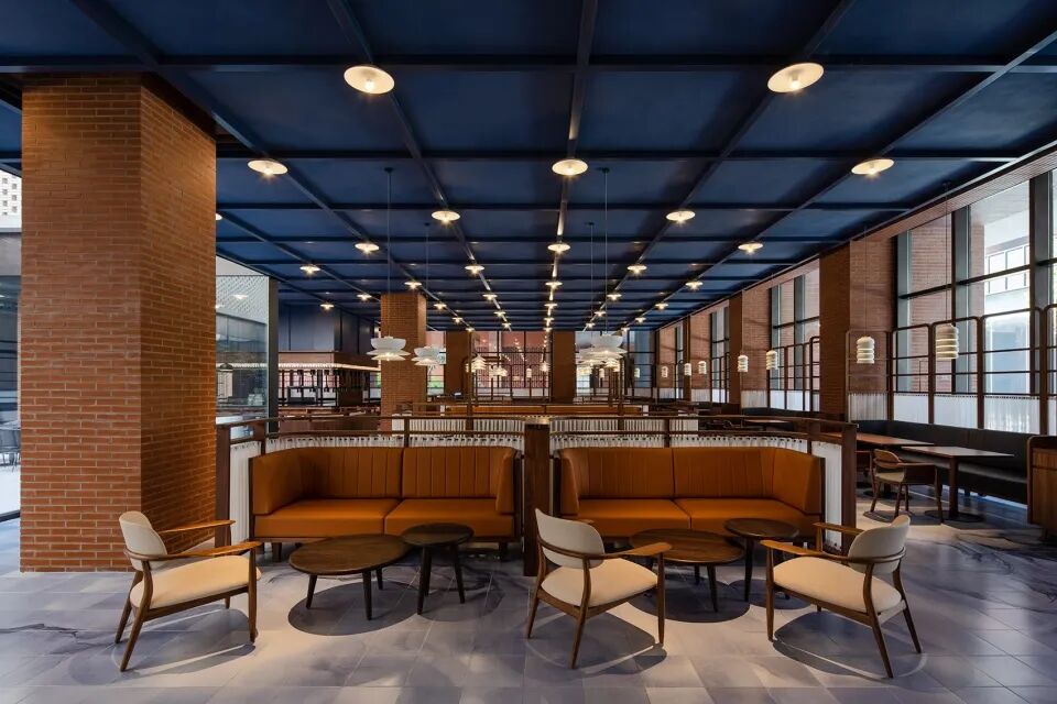酒店现代砖砌建筑由大卫·奇普菲尔德工作室设计,由三个庭院区块组成,介由一条宽敞的室内街道相连。