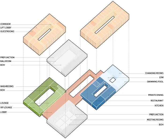 我们的第二个手法是将三个体量中的每一体都赋予了不同种陶瓷工艺。休息室上以绿釉。餐厅和水疗中心以钴着色为蓝釉。会议和宴会厅则彰示白瓷的轻盈和透明。穿过酒店,就是穿过不同工艺瓷器的过程。在标准酒店中的一系列大理石在这里变成了匠艺与技术的万花筒。