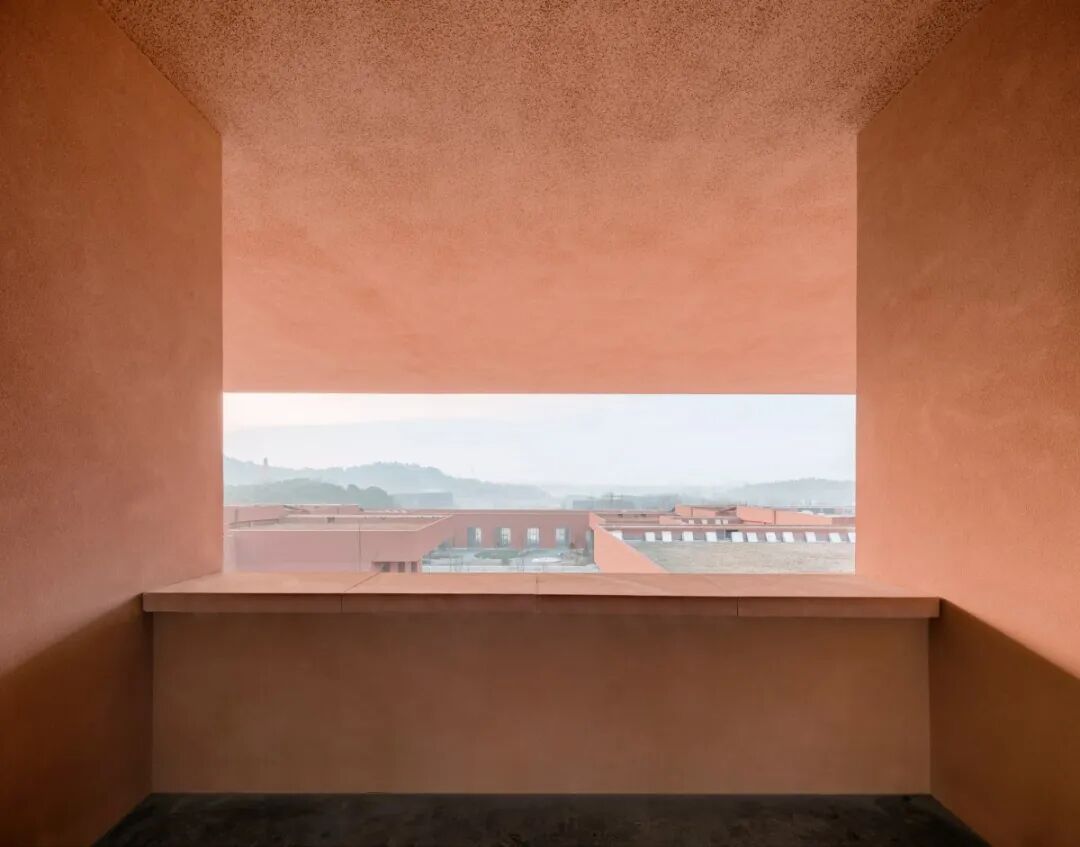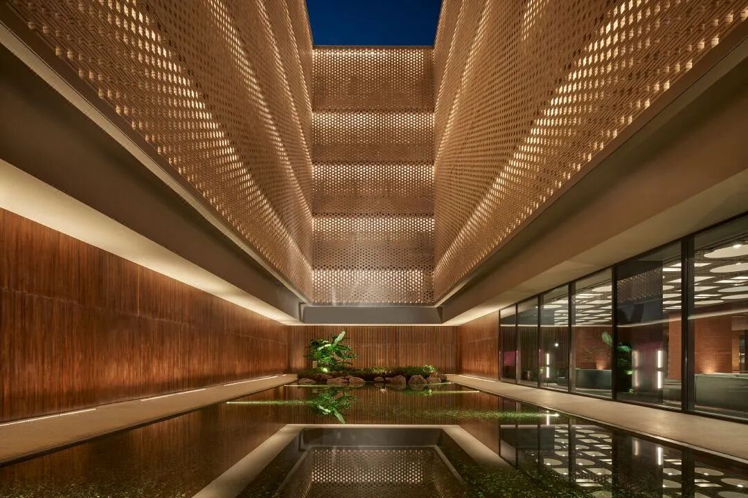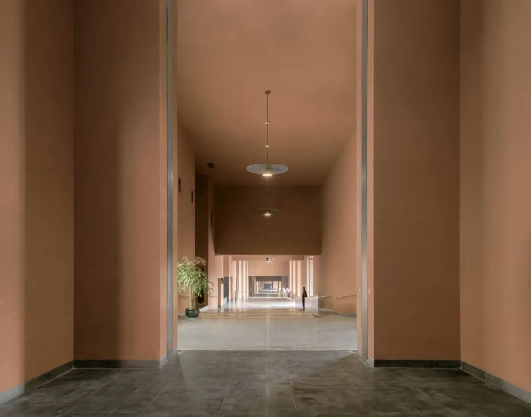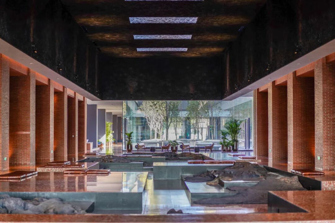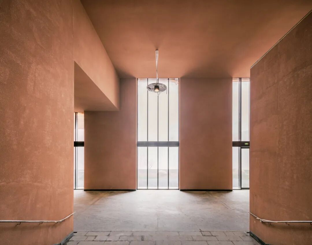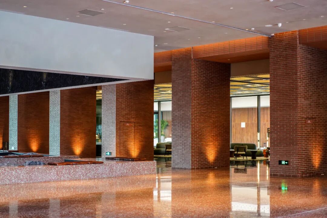 酒店简洁的建筑表现力是由红砖立面赋予的,建筑师用开放式的分区和栅栏来对应整体元素。AIM建筑事务所的设计师解释说:“在每个空间中,我们试图以自己的方式使用陶瓷装饰材料。”“在这里,你可以看到粗糙、未加工的陶土表面和脆弱而复杂的瓷器的对比组合。”用于迎接客人的是一个宽敞的大厅,里面有一个由红色水磨石制成的极简主义的迷宫式平台,以配合红砖柱子。在这些平台上,建筑师们放置了类似熔岩的装置,其灵感来自于传统的陶瓷窑炉和伴随着烧制的过程。