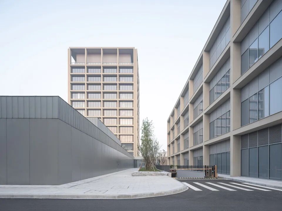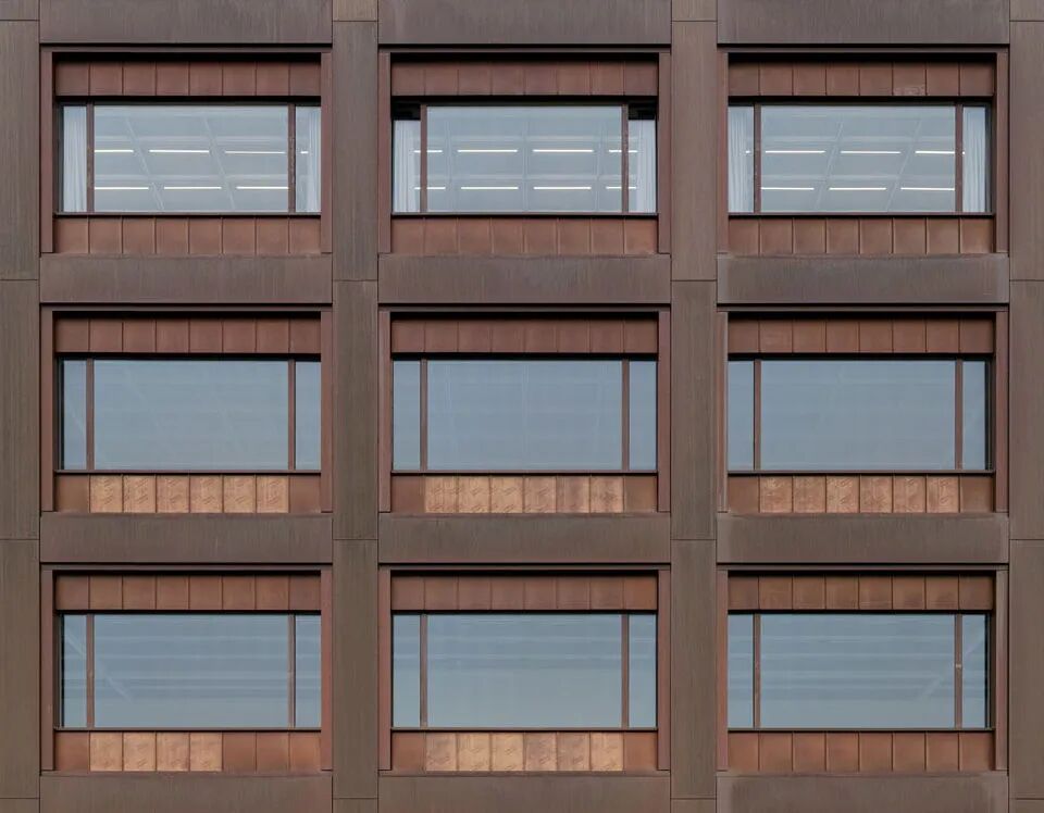 杭州莫干山路10层高的办公大楼有着简练板正的几何形体与外观。钢筋混凝土结构上包裹的铜外表皮,让建筑在杂乱的环境中更加气质非凡与引人注目。整个外表皮的设计工整精致,采用直立锁边技术完成高精度设计,最终实现一个优雅而不失活力的外观。
