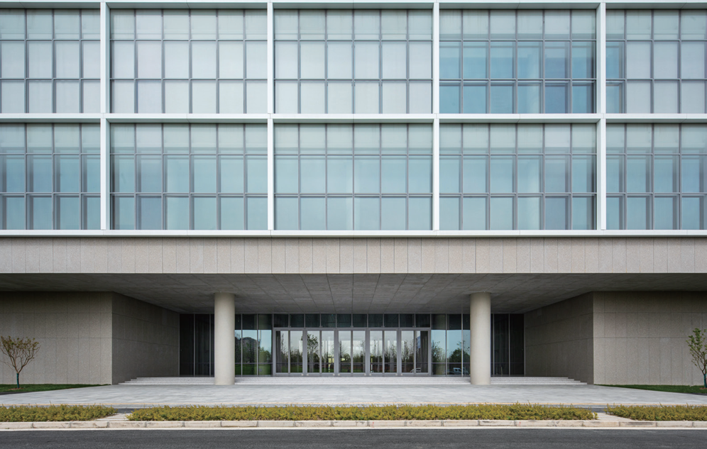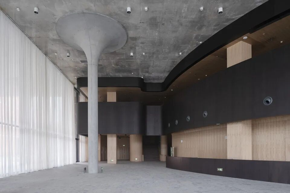 整栋建筑的主门厅排布着巨型蘑菇状立柱,分列于玻璃幕墙两侧,支撑起硕大的混凝土外展屋顶。门厅以内的空间亦使用混凝土建材,木纹饰板和玻璃块拼成的幕墙带来一份细腻的触感。