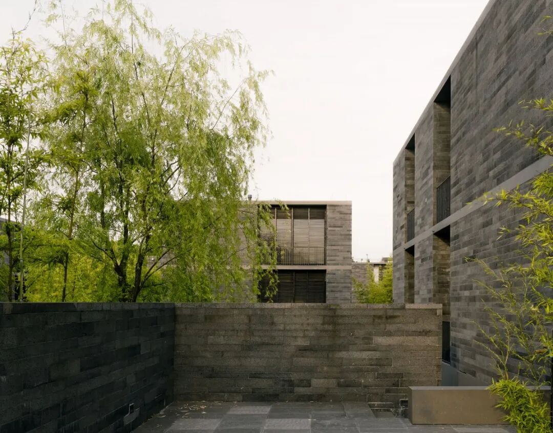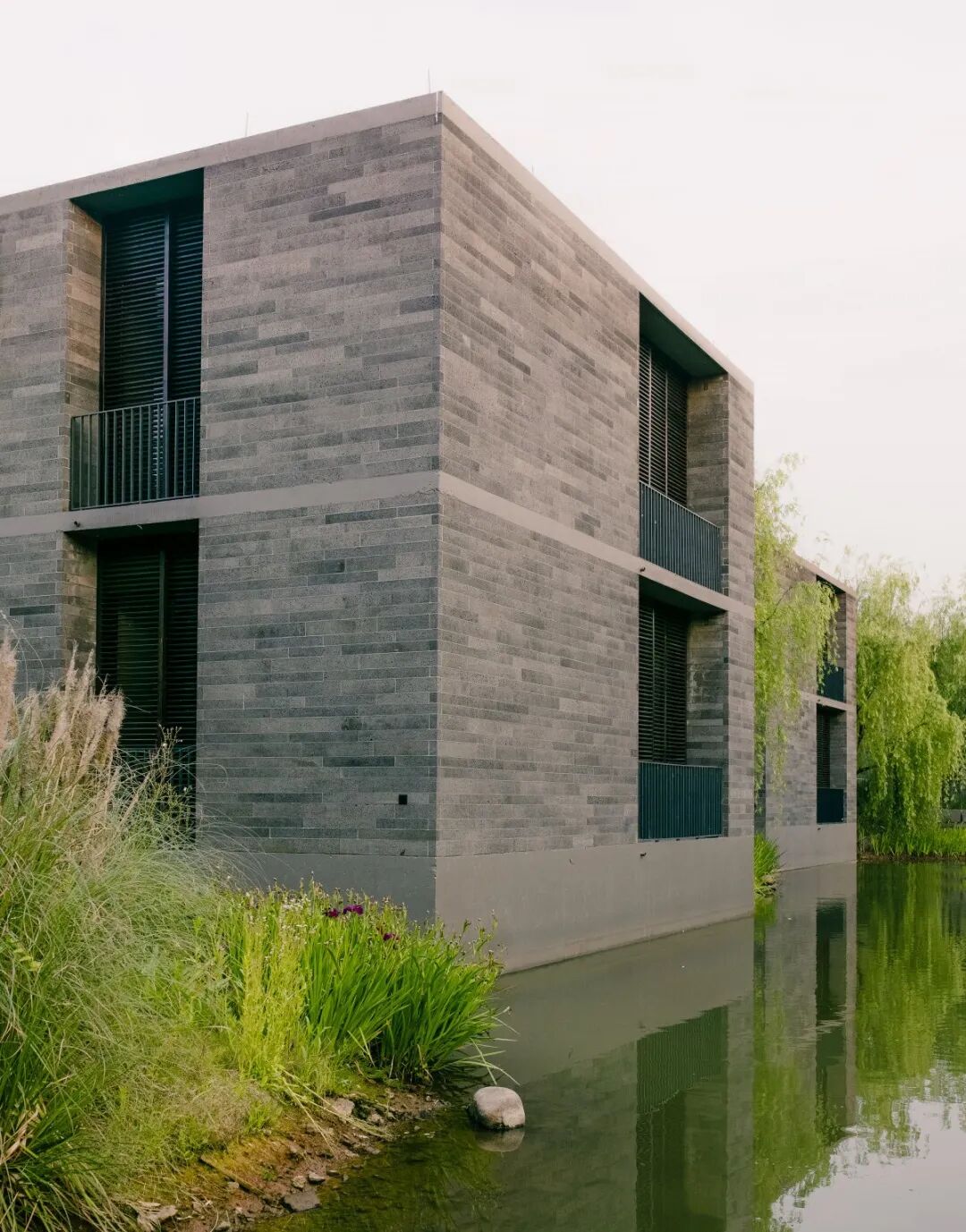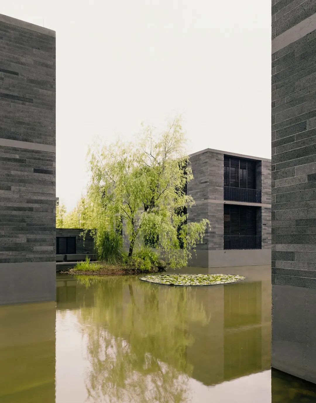 西溪天堂·悦庄由20座临水建筑组成,周边围绕着多个五星级酒店。建筑环绕着水系花园,仿佛嵌入其中的深色石块。建筑外立面以灰色的火山岩墙面和立方体的形状构成,延续了戴卫·艾伦 ·奇普菲尔德爵士CH一贯自然、简洁、冷峻的笔触。