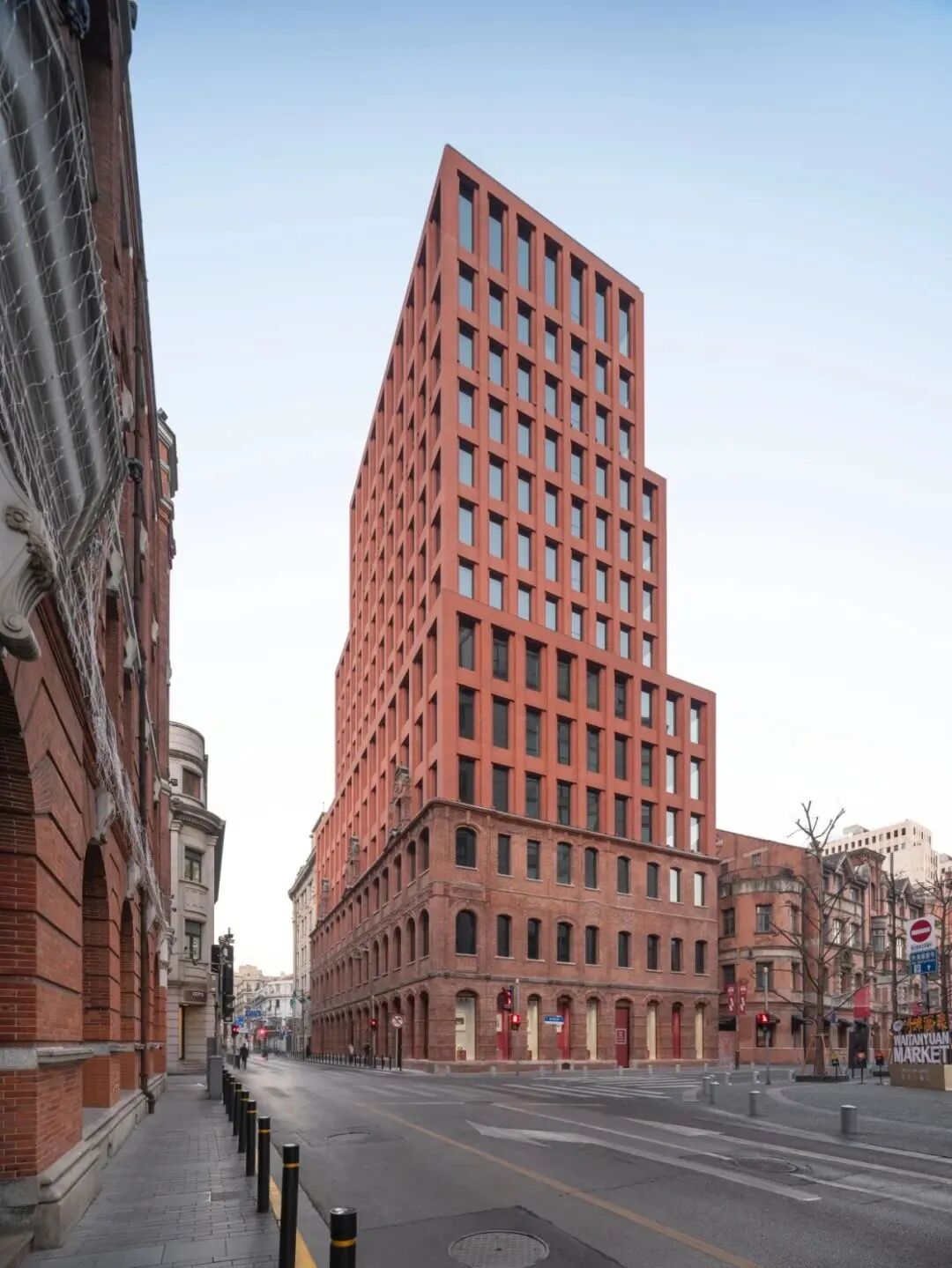 考虑到在一片历史保护区域中,新建筑应该与老建筑和谐共生。作为沿街建筑序列中的醒目标志,改建后的众安·美丰大楼成功实现了新与旧的共生——下半部保留了原有维多利亚风格的清水砖墙建筑立面;上半部贴临历史砖立面向上延伸11层而成的一幢14层办公建筑,外立面延续了原有比例,体量上在不同方向回退成退台,体块交错,形态多样,能够减小行人视角可能产生的压迫感,与周边城市空间的友好关系。