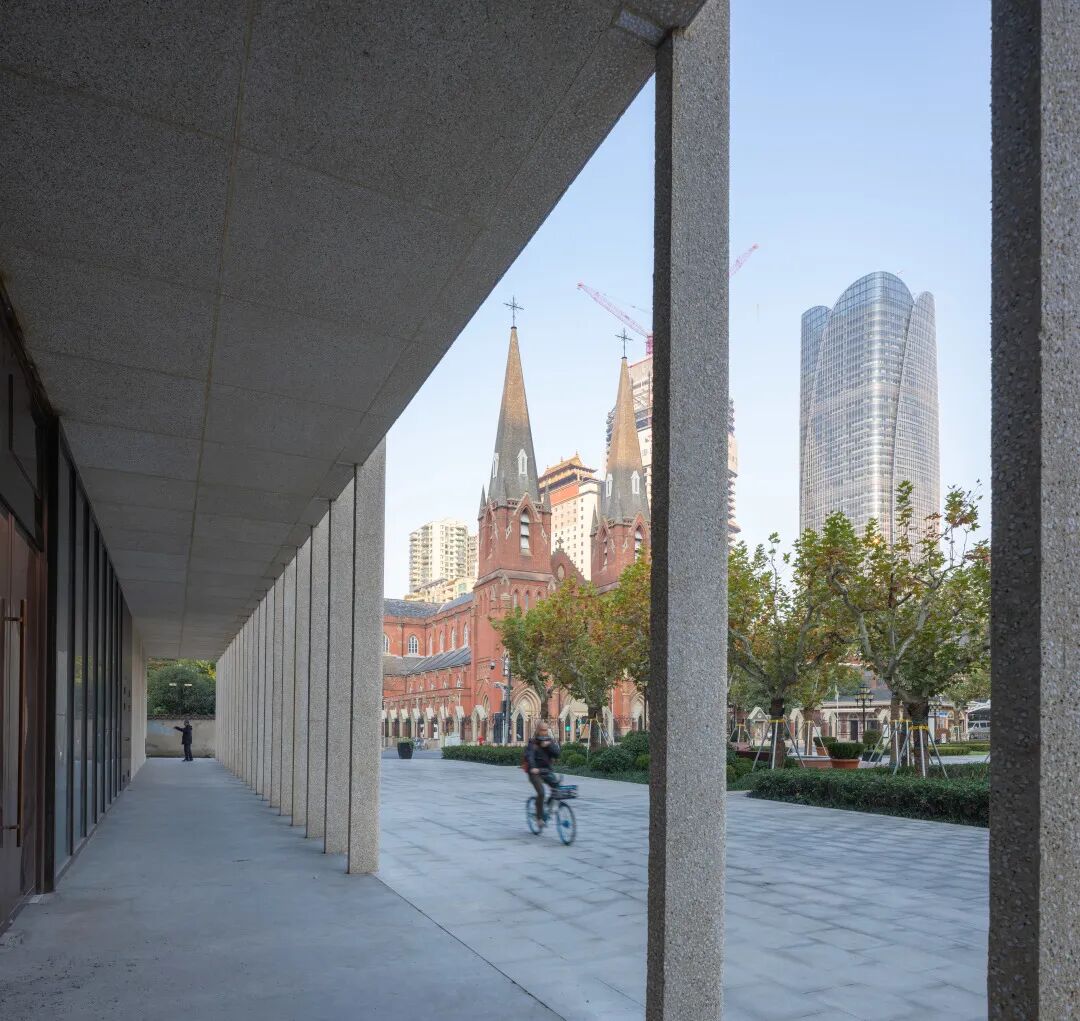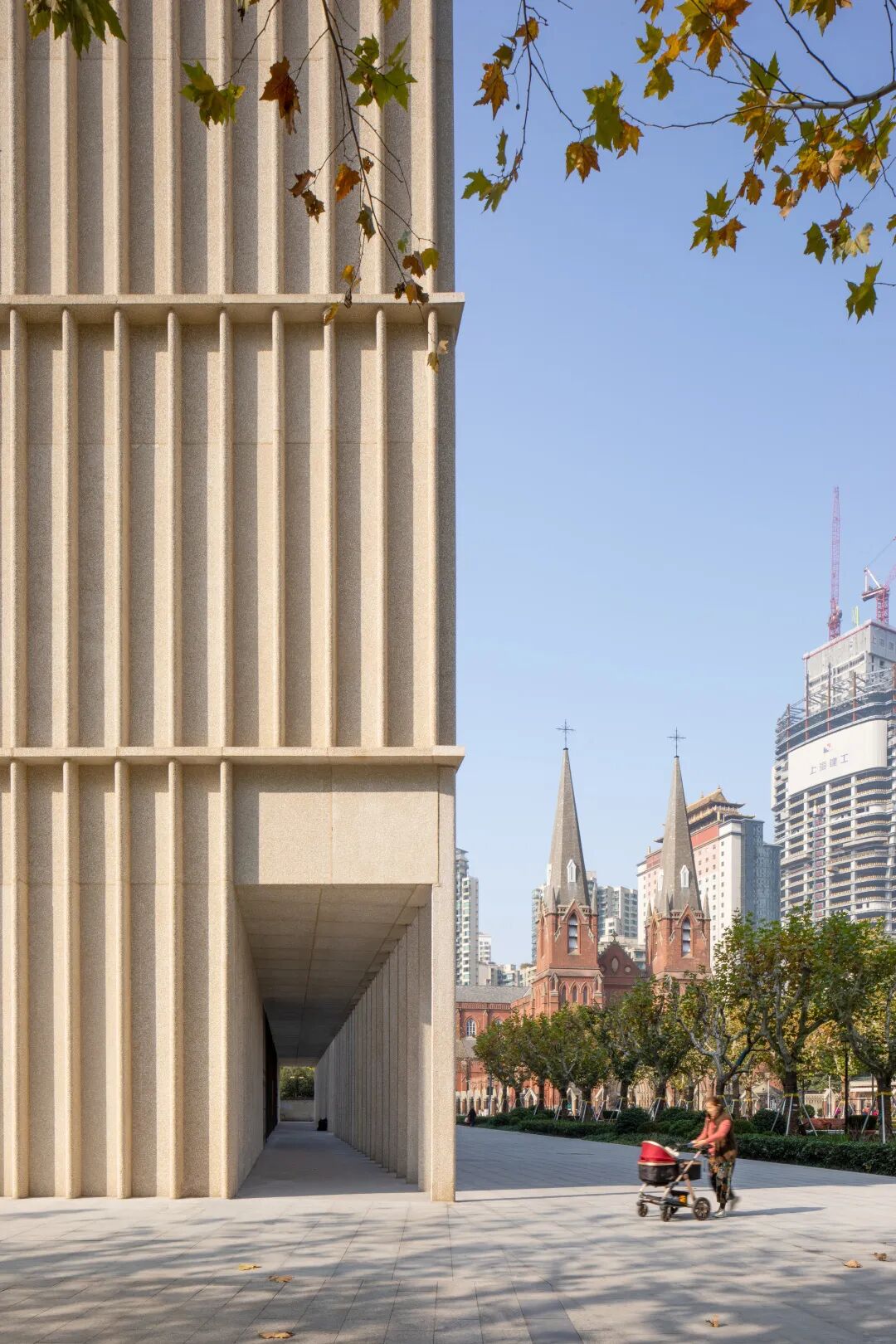 人们可以通过西侧与书店和咖啡馆相连的龙腾大道进入,也可以通过东侧的滨江步道直接进入下沉庭院,或者拾阶而上到二层露台进入中央门厅。登上被抬升的地面广场,可纵览黄浦江的景色,也可沿着台阶漫步到河岸附近的休息平台。
