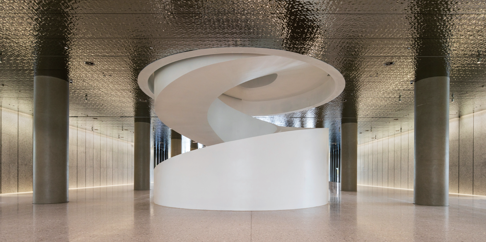 矗立在上海徐汇滨江绿化带的最北端的西岸美术馆,是西岸“美术馆大道”的核心场馆之一,是构建区域乃至城市公共文化空间的重要平台。三角形的地块上,三个承载着展览功能的建筑体量呈风车型旋转排布,并通过中央的双层通高门厅联系。
