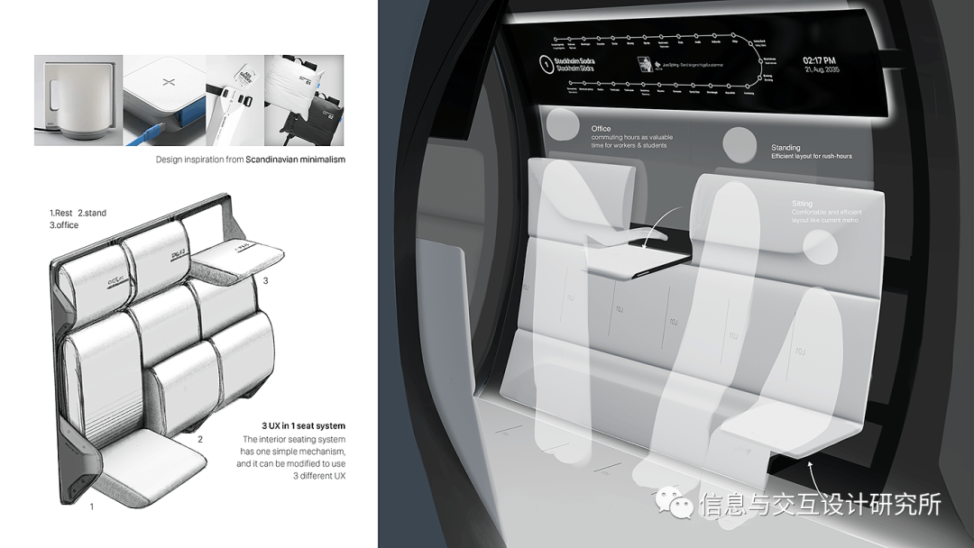 Polestar Trambus 丰富了乘客的出行时间。应用于内部的灵活座椅系统允许一个座椅以三种模式运行:坐、站和工作(办公室)。使用该系统,Trambus 中有休息(坐)、站立和办公(办公桌)区域,用户在他或她想要的区域继续愉快的移动体验。每个总线模块之间存在铰接模块(连接器),因此总线之间的移动是自由的。