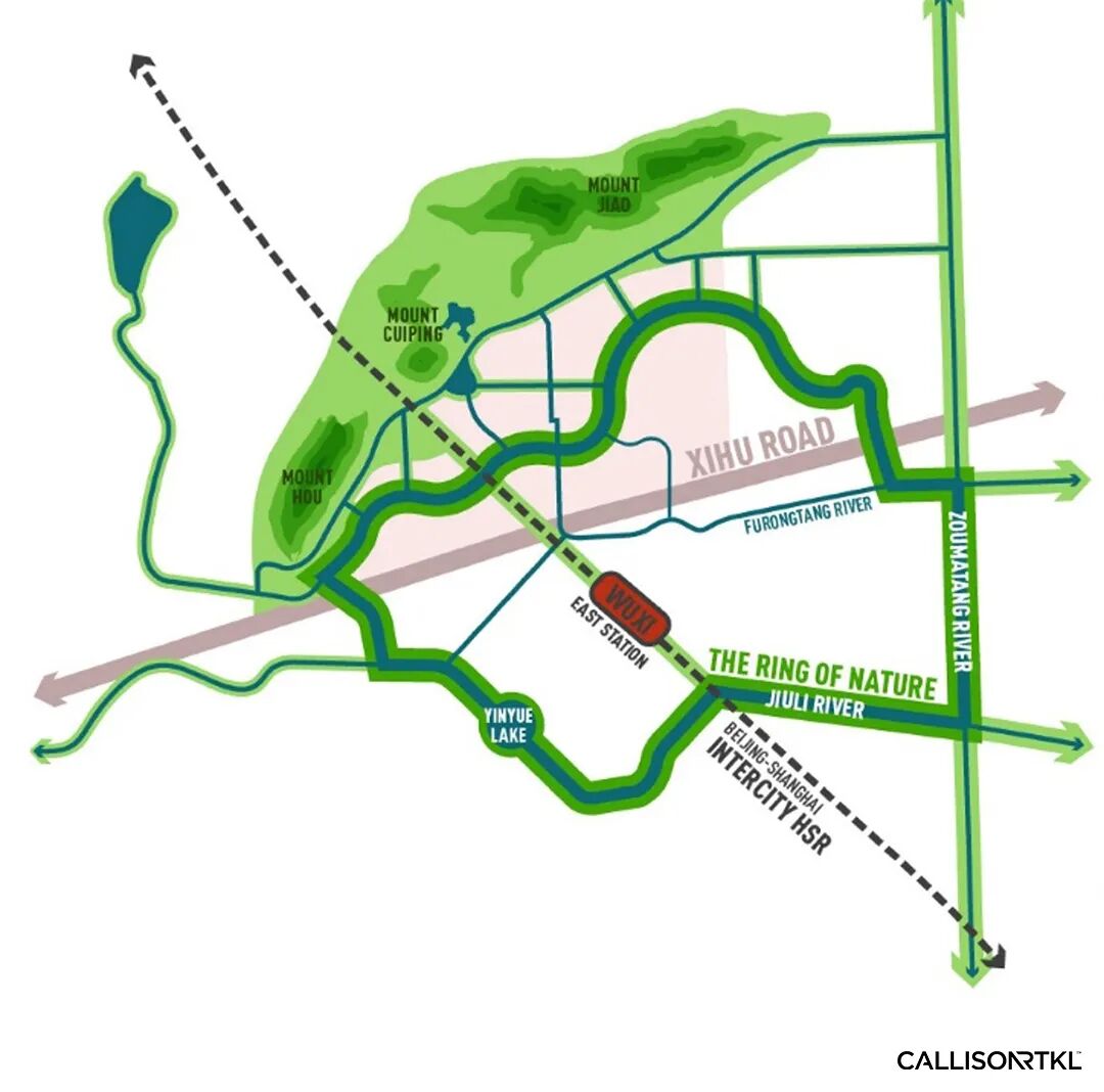 席卷全球的新冠疫情不仅改变了人们以往的生活方式,也深刻影响着城市设计和建筑行业的发展。作为完善无锡锡东新城中心区的最后一块拼图,项目基地锡沪路北片区南邻京沪高铁无锡东站,北接翠屏山旅游度假区,是城市建成区与山地郊野之间的过渡。CRTKL在2021年启动了城市设计实践的探索工作,为无锡寻求后疫情时代的城市新型增长模式。