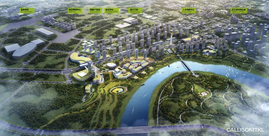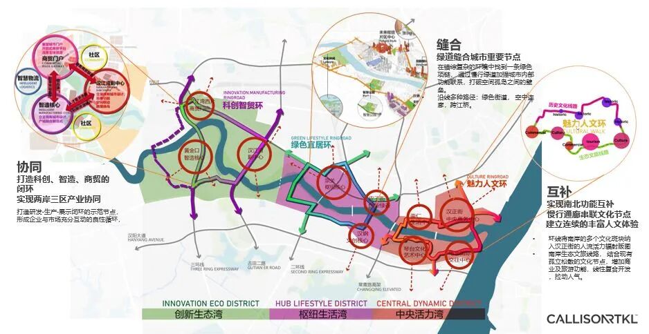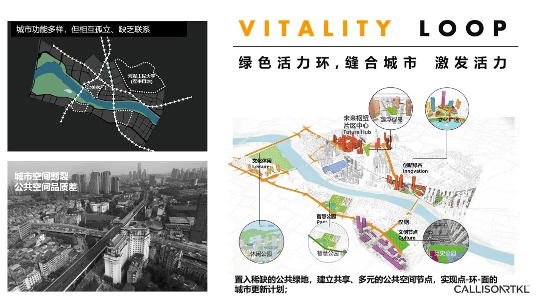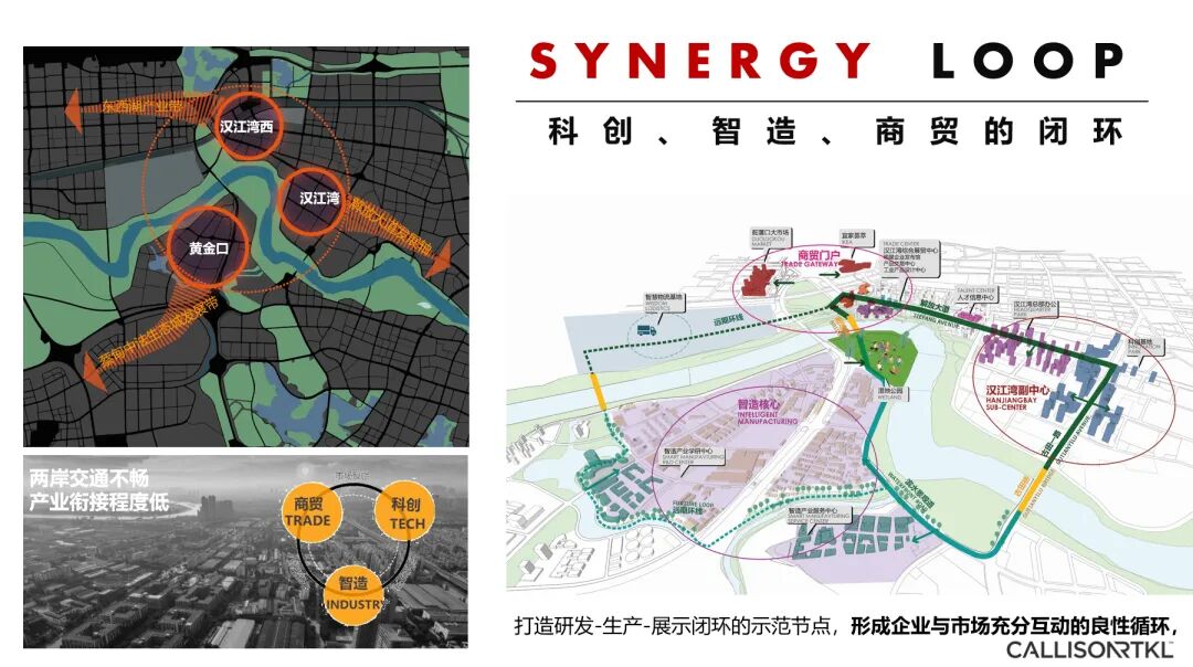于是,我们梳理了从解放大道至古田一路以及滨水生态景观廊道的科创智贸环。旨在建立跨江的产业协作,建立研发-中试-制造-展示的产业链。通过这13公里长的产业协作环将产业资源和土地资源进行最优的配置和利用,将南北两岸原来影响城市发展的工业区变成活力源和动力源,给原来功能单一的汉江湾片区带来生机和活力。