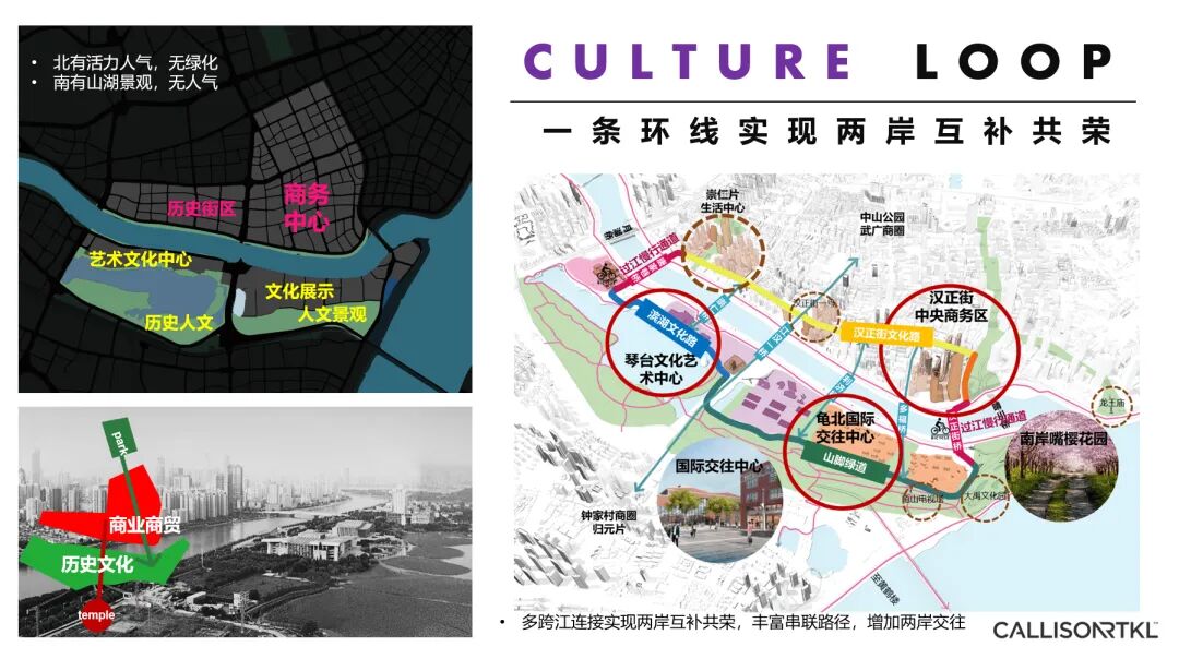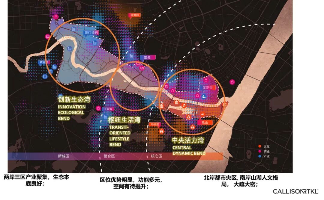 中央活力湾片区位于两江交汇处,已是武汉城市脉搏强有力的区域。北岸已有汉正街历史文化街区以及未来的商务商贸中心。南岸已有大型文化场所琴台大剧院以及山-湖人文景观月湖龟山。为了加强两岸脉搏之间的强联动,我们梳理出一条12公里的魅力人文环,串联两岸的商业文化场所空间。未来我们希望在这片区域内看到无边界和零距离的城市功能交融,在商业休闲活动进入文化空间的同时,文化活动也进入消费空间。这种双向渗透既能让文化活动回归城市生活,促进了文化空间的生活化和经济化,又能推动更多类型的城市空间融合,形成共生共荣的城市生命体。