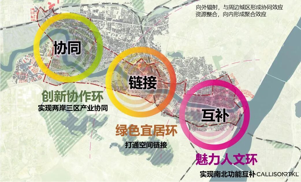 我们认为,首先只有让城市的血脉畅通才能产生有力的脉搏,城市才能良性的循环和健康的生长。昼夜循环的交通系统毋庸置疑视为城市主动脉,我们以现有城市道路为切入点,将原来以交通为导向的道路重新梳理,定义成为缝合两岸的人文环、绿色环、产业环。尝试从营造人文场景,提升开放空间环境,加强两岸功能对话,三个角度出发塑造三环。