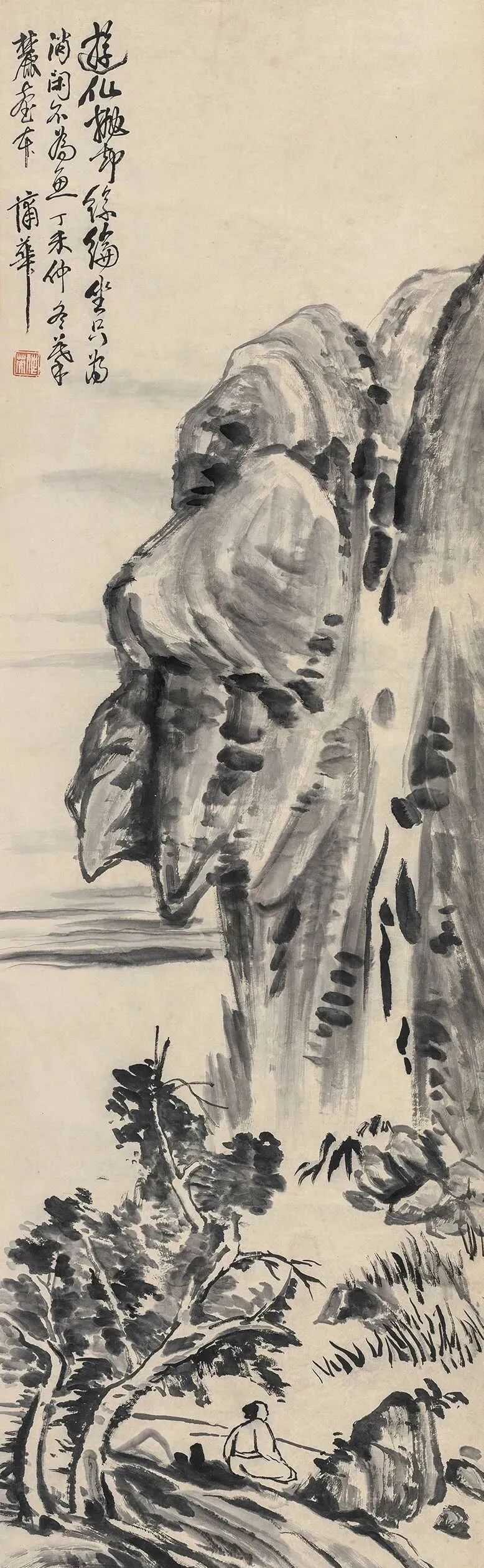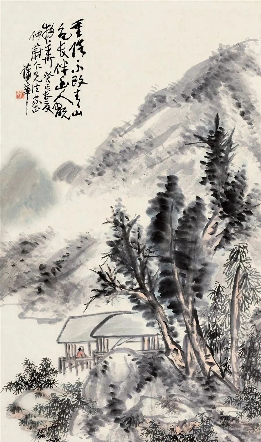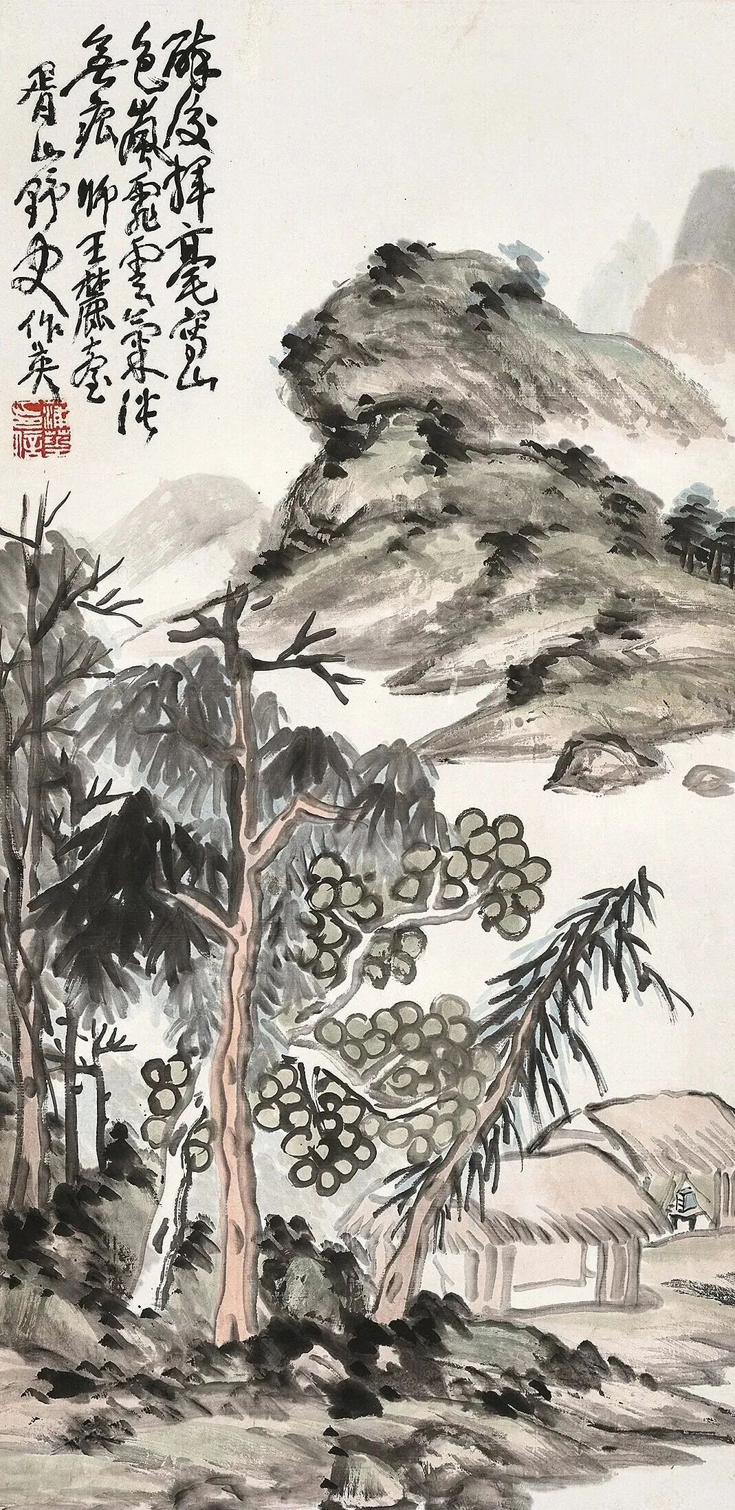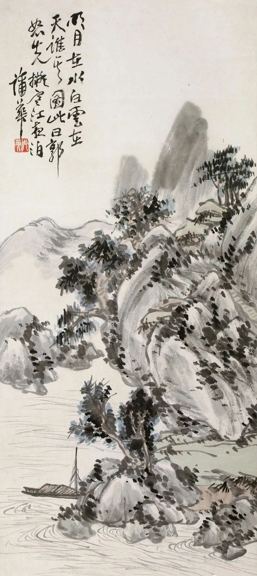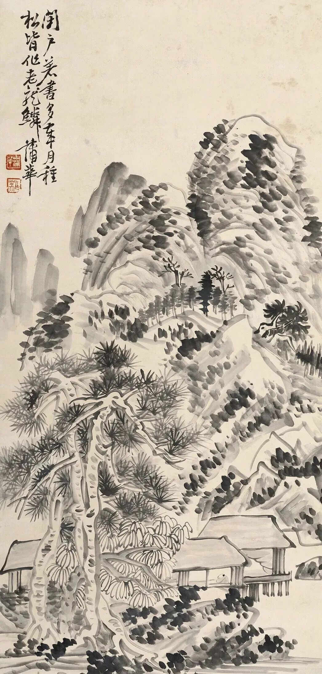 蒲华山水画粗笔写其意,化皴为擦染,树法变粗简,大点加其苔,多以水墨为之,兼作设色,给人一种雄强野逸之感,于凌乱中求次序。关于蒲华山水画的师承问题,邵洛羊曾指出:“其山水树石,纵放恣肆,水墨淋漓,取法于石涛、石谿。