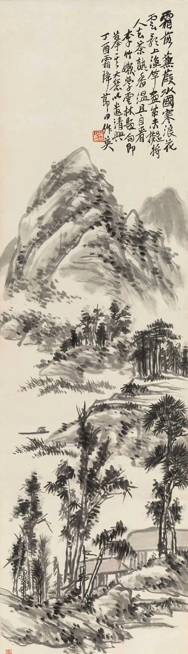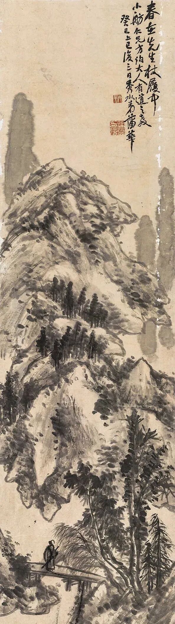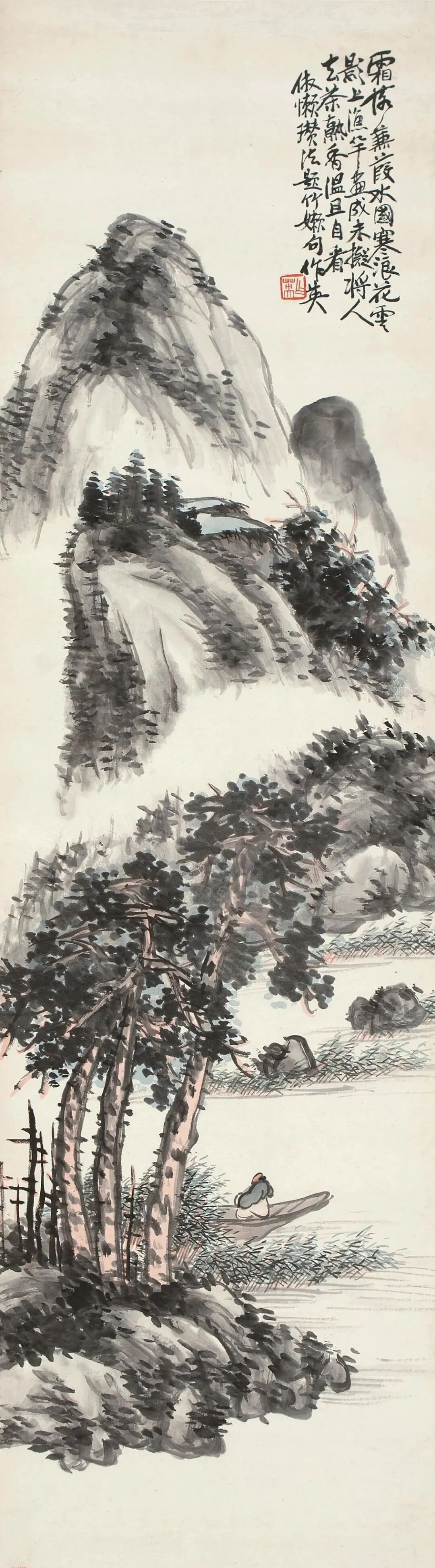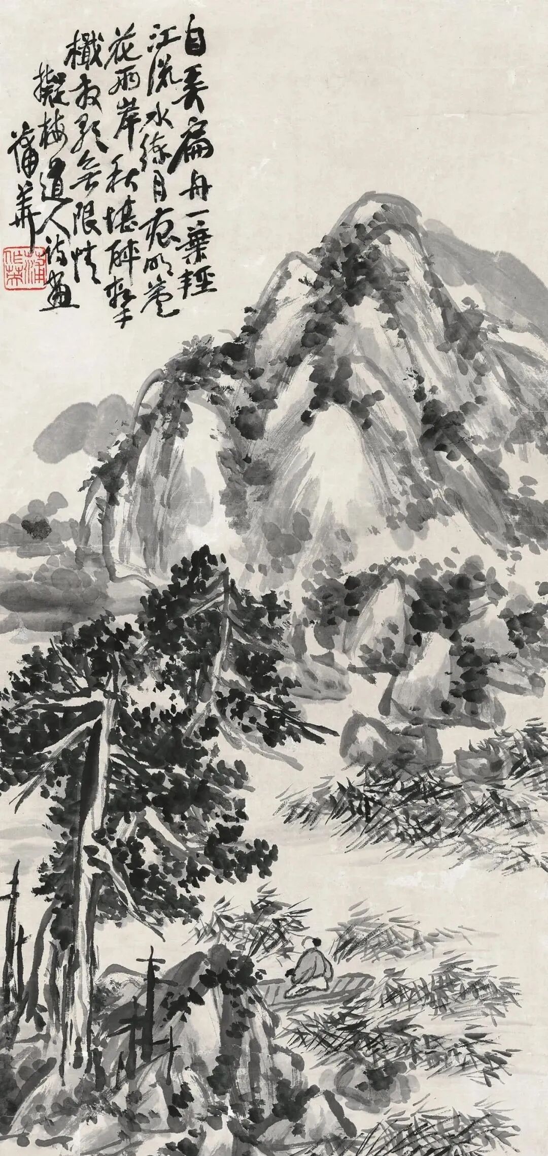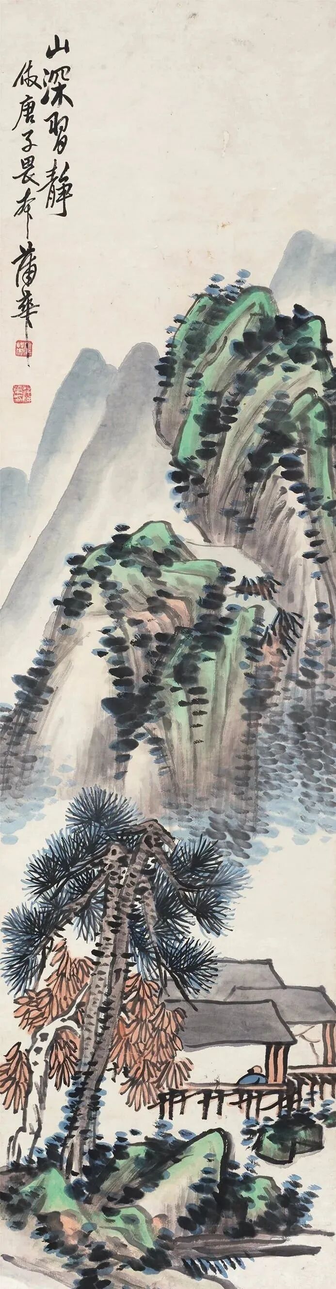 蒲华山水画粗笔写其意,化皴为擦染,树法变粗简,大点加其苔,多以水墨为之,兼作设色,给人一种雄强野逸之感,于凌乱中求次序。关于蒲华山水画的师承问题,邵洛羊曾指出:“其山水树石,纵放恣肆,水墨淋漓,取法于石涛、石谿。