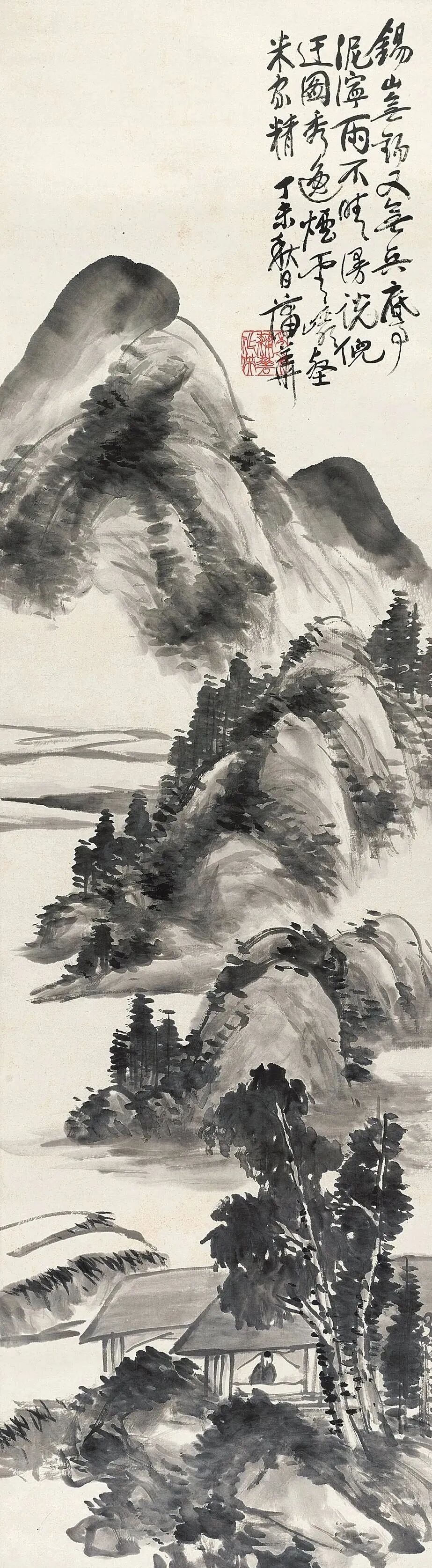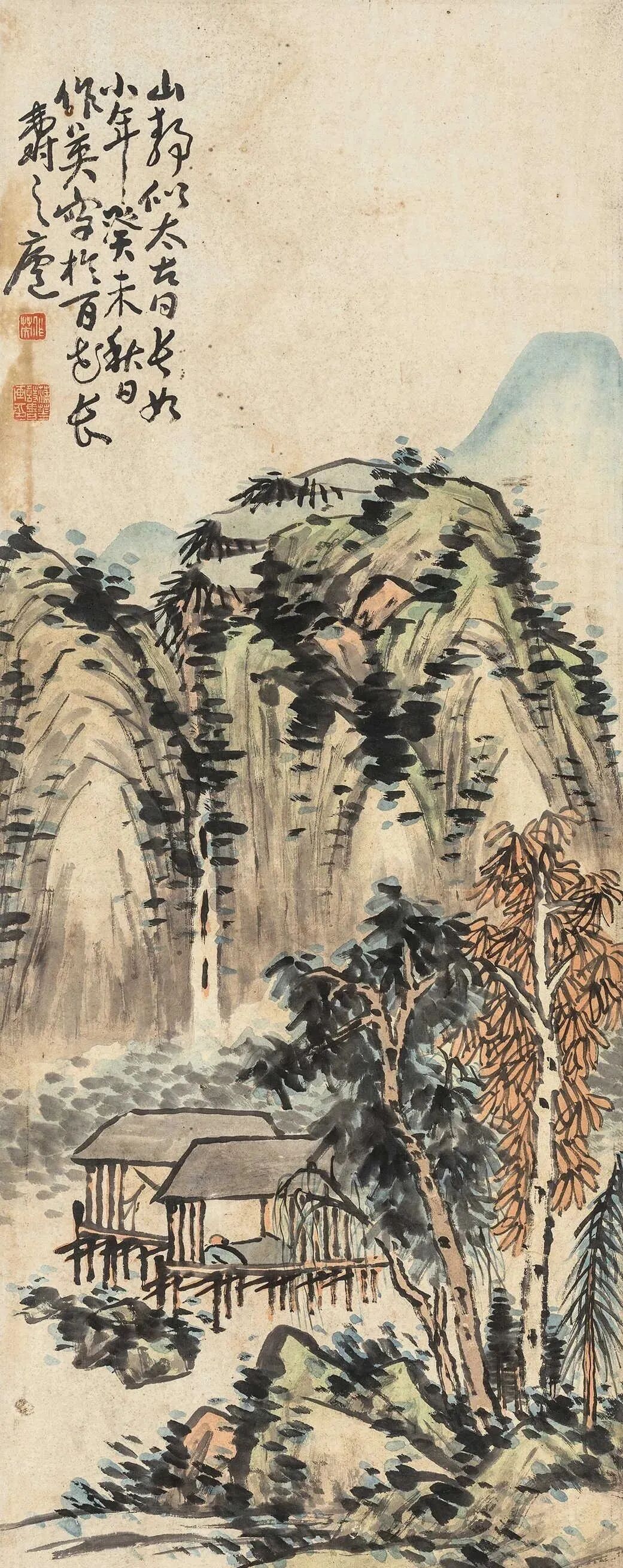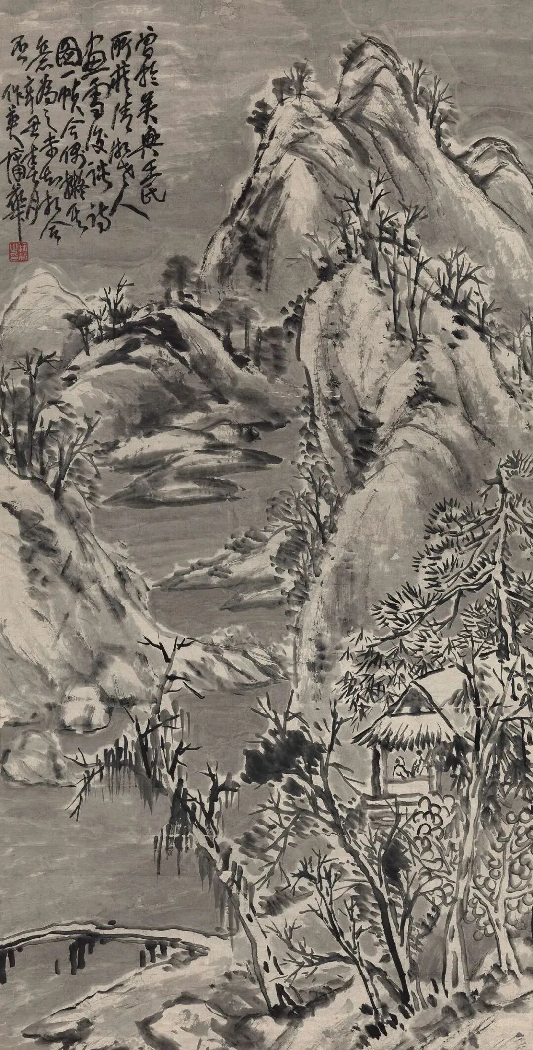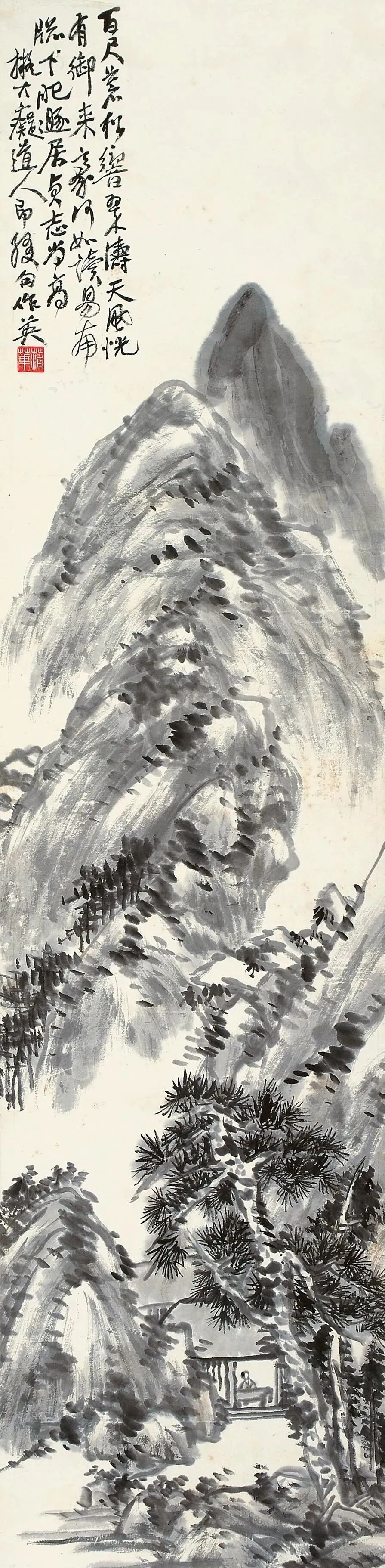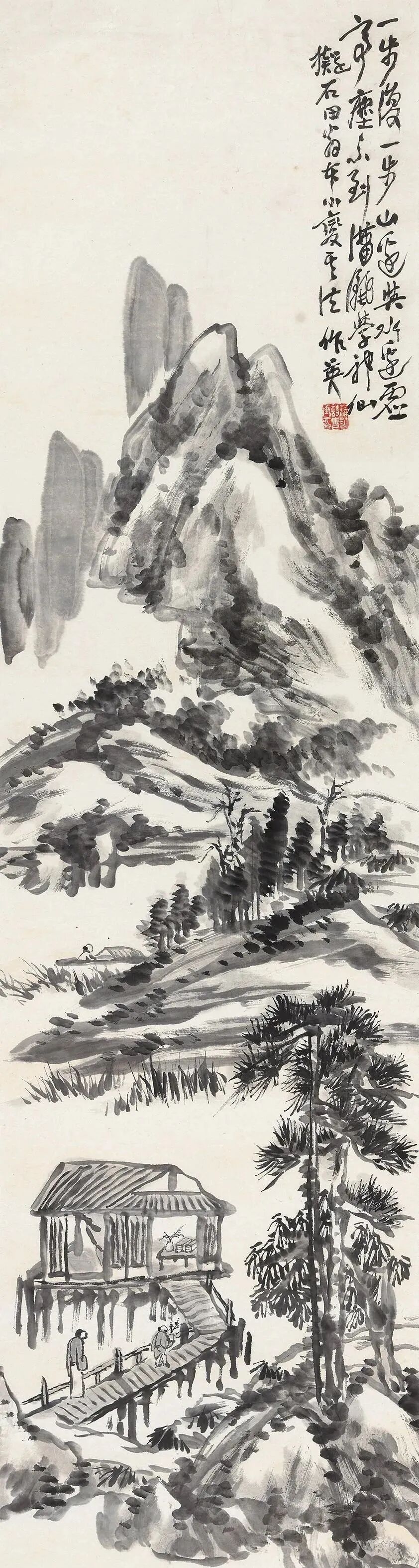 蒲华山水画粗笔写其意,化皴为擦染,树法变粗简,大点加其苔,多以水墨为之,兼作设色,给人一种雄强野逸之感,于凌乱中求次序。关于蒲华山水画的师承问题,邵洛羊曾指出:“其山水树石,纵放恣肆,水墨淋漓,取法于石涛、石谿。