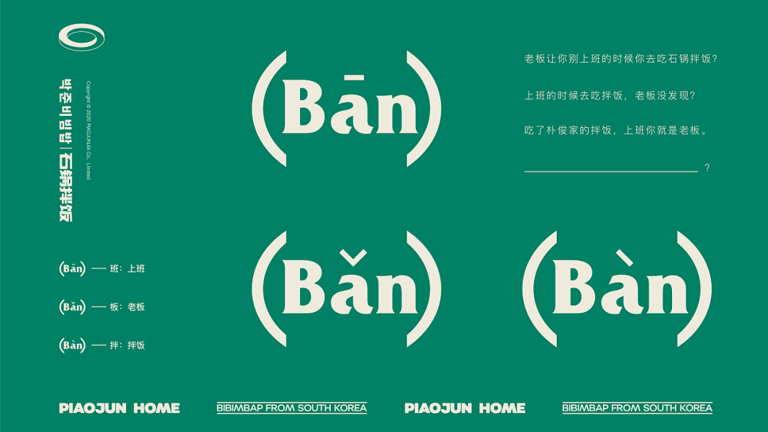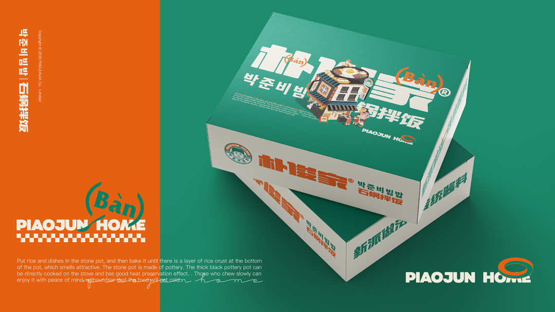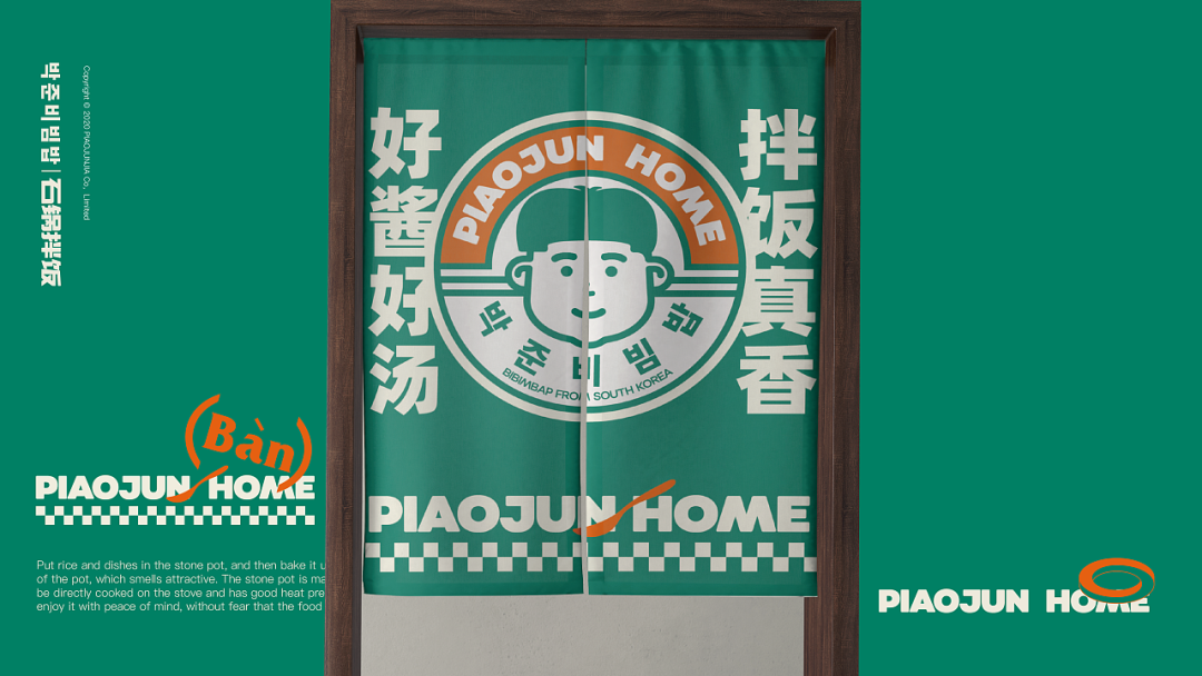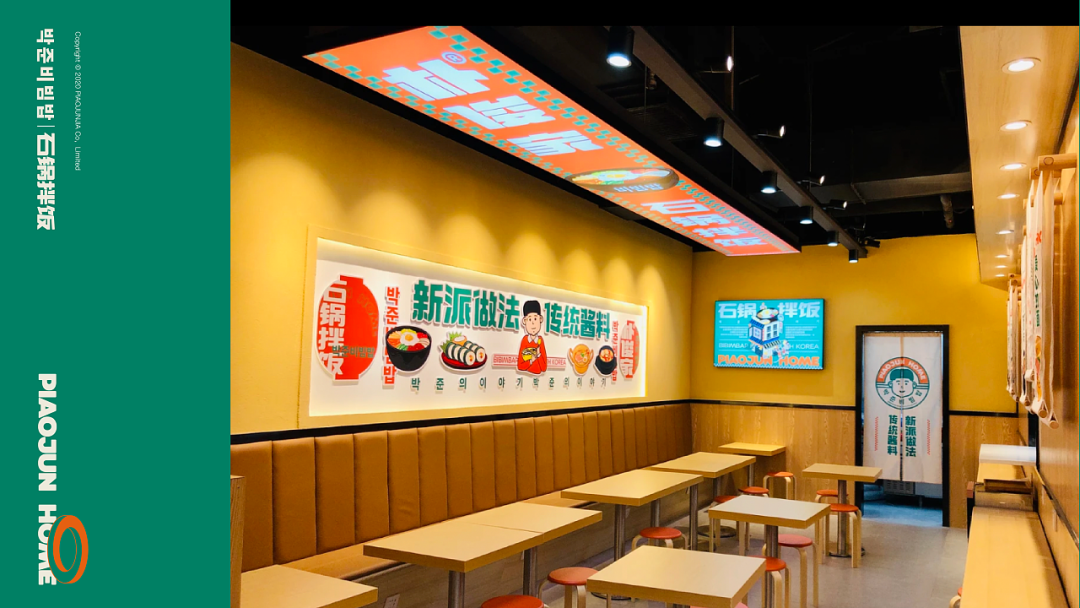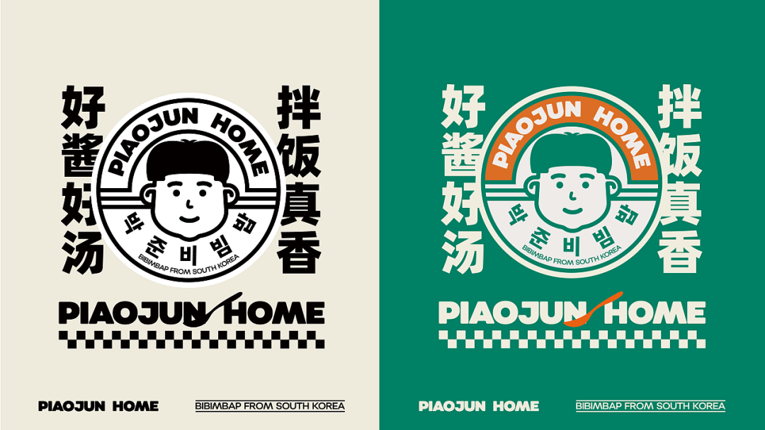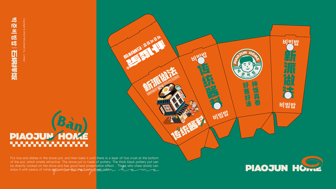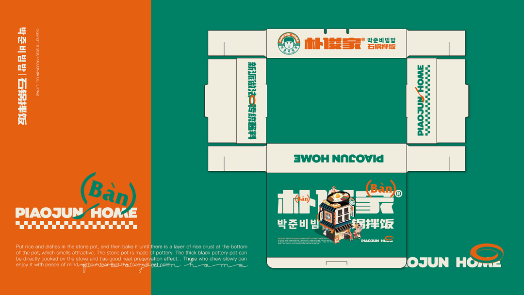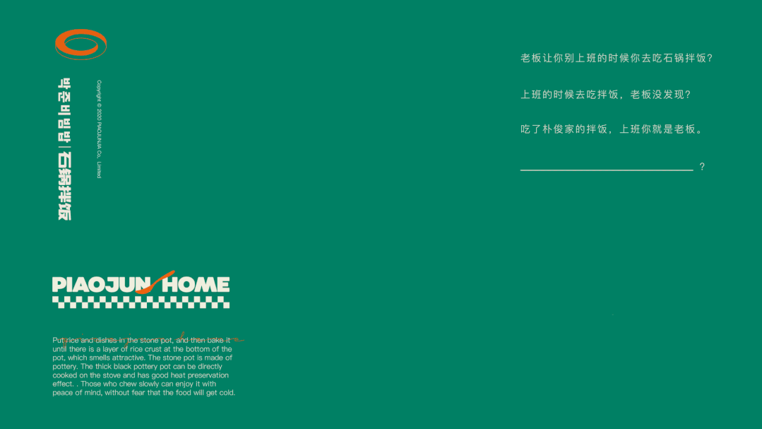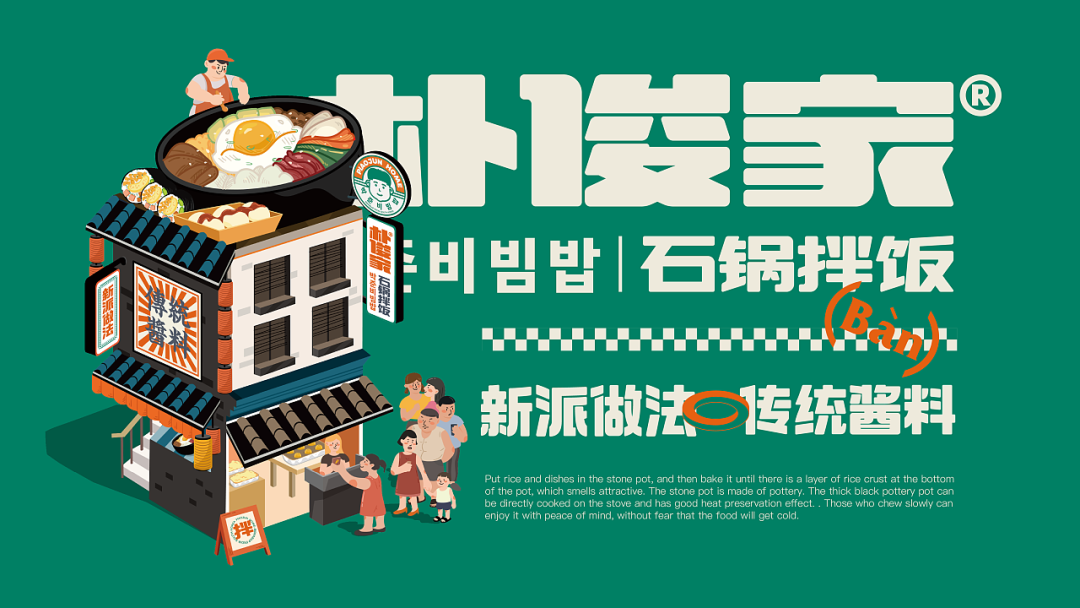 以下这个朴俊家的石锅拌饭品牌,设计上以复古的绿色调为主,插画内容则围绕朴俊这位老板展开描述:老板每天都在门店研究如何用传统酱料结合新派做法,给消费者呈上一份别样的石锅拌饭。老板的用心、诚意,正体现了品牌核心的精神和态度,值得一试