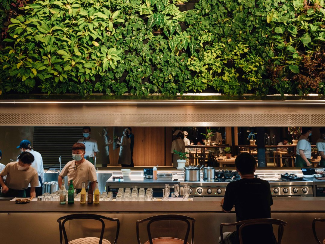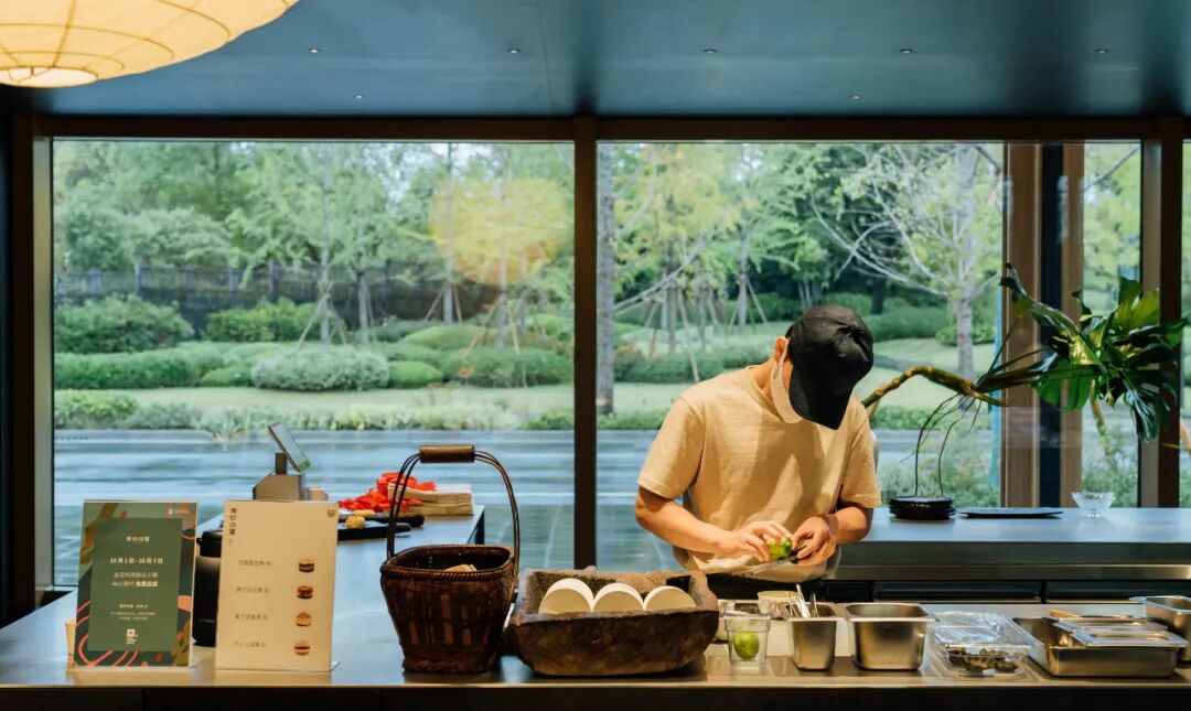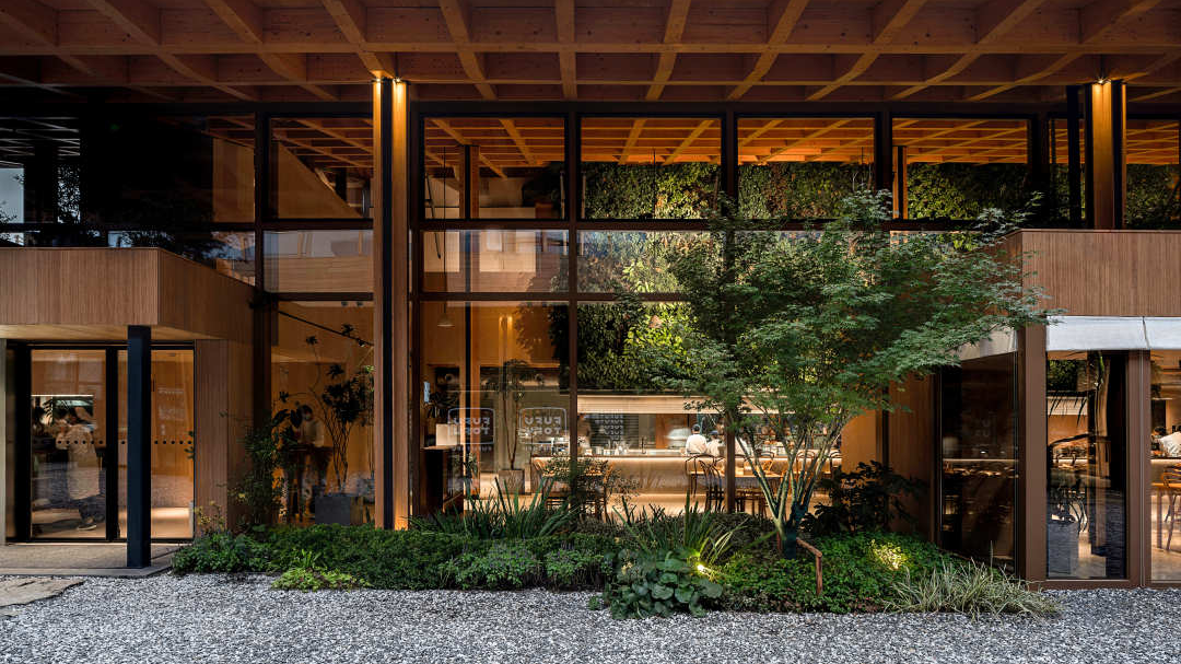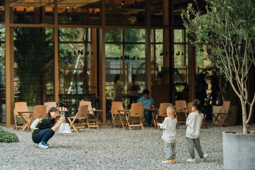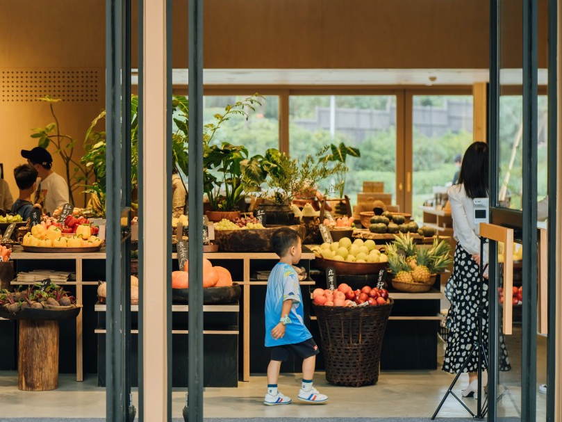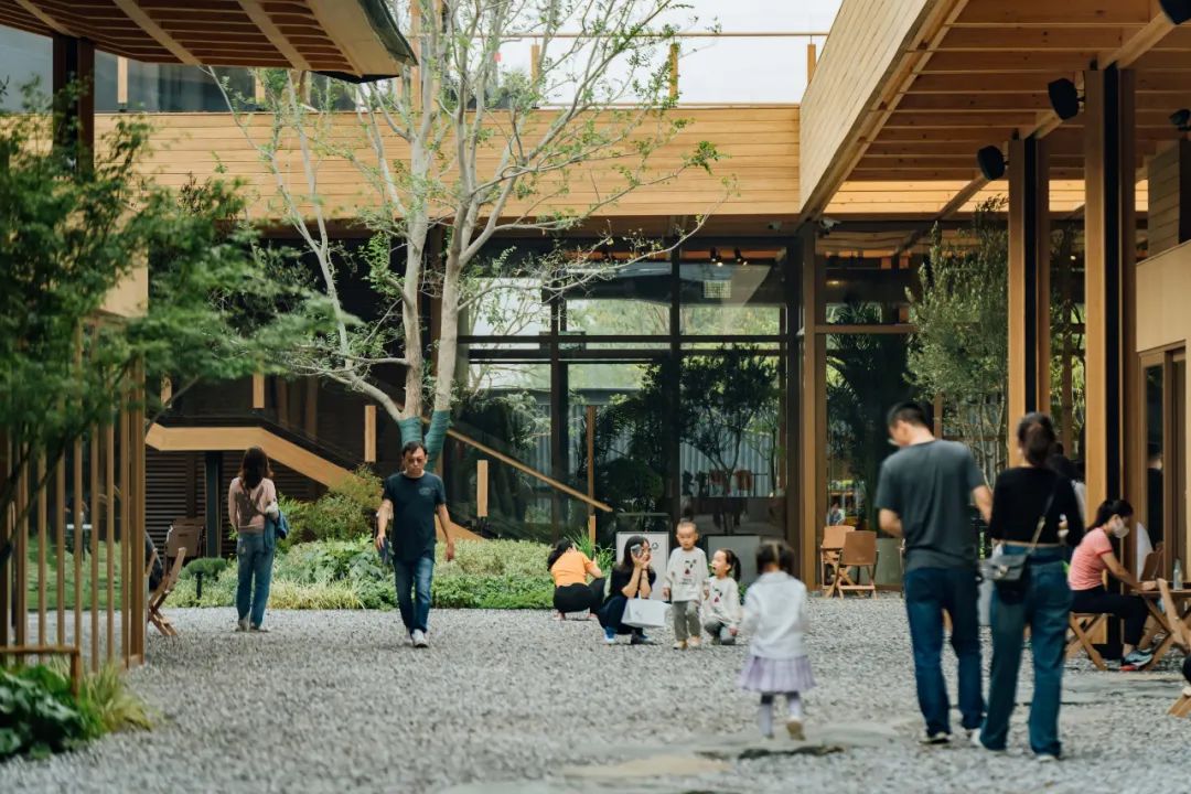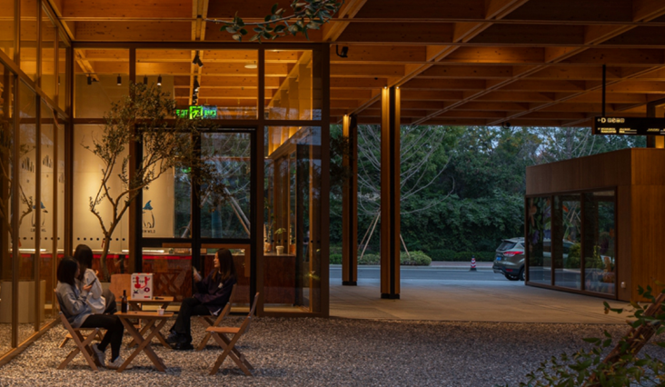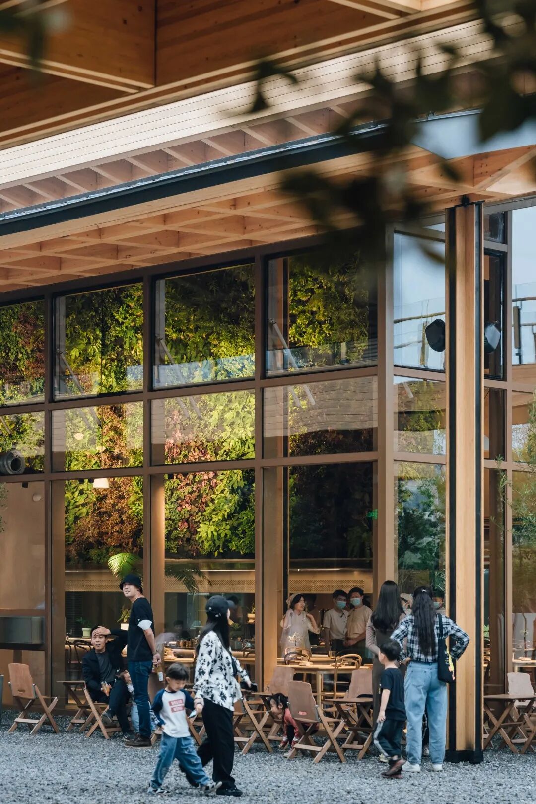 在“合体、适宜”的原则下,“退让”并非不作为,是应对市集项目特点的最佳策略。不冒进不争先,为人的实际使用,留出商铺展示画面与舒适活动区域;烘托展现建筑木构之美,成就室内外空间的通透;布置适当观赏点,以花艺手法布置植物,让整体空间浑然一体。