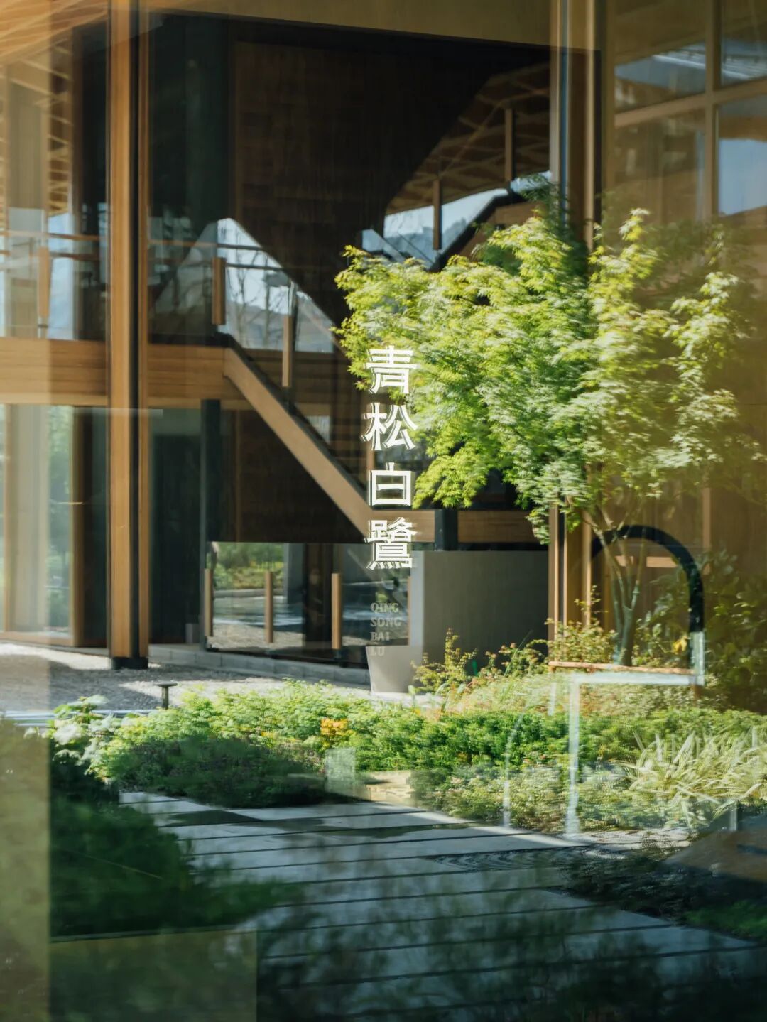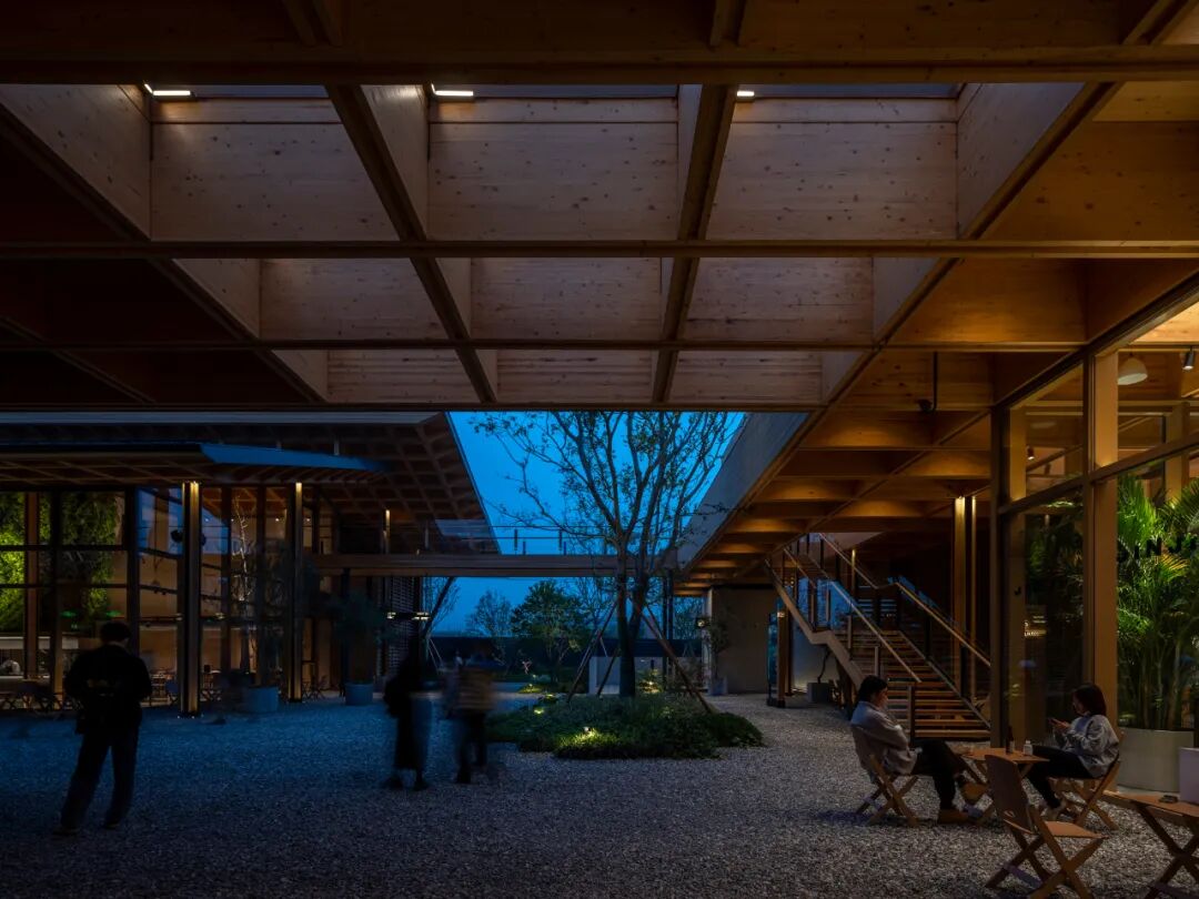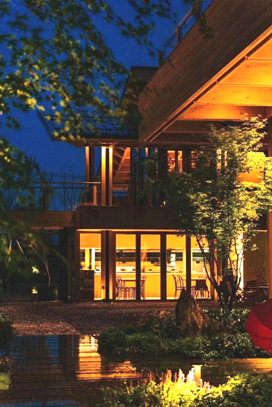 灯光设计上也接续了退让美学的叙事,弱化景观灯,着重表达阴翳之美。“美并非在于物体,而在于物体与物体相合而生的阴翳之浓淡明暗。”让建筑站上舞台,以原木的金黄映衬天空深蓝的幕布,景观只辅佐少量特定角度的灯光,拉出树冠层次,映衬出独特的墨绿质感,在建筑玻璃的透景画面下内外难辨。