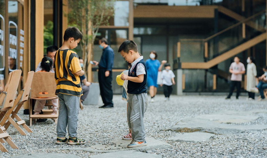 通过打造非标准化的商业空间,我们希望市集商业与景观的树木一同,自在呼吸。内街全面铺设砾石,这种不利快步通行的材料,与外街规整人工的铺装形成对比,带出更具温度的手工气息。快速行走不易,索性放慢脚步,与石子的棱角厮磨,反而成为打破都市效率生活的契机。下次拜访时,也会特意选择软底舒适的鞋子,人均球鞋的视觉画面,也成为市集空间更具闲适感染力的机会。砾石的透水性、多孔性等生态优势,也与理想国绵延的雨水花园相应。