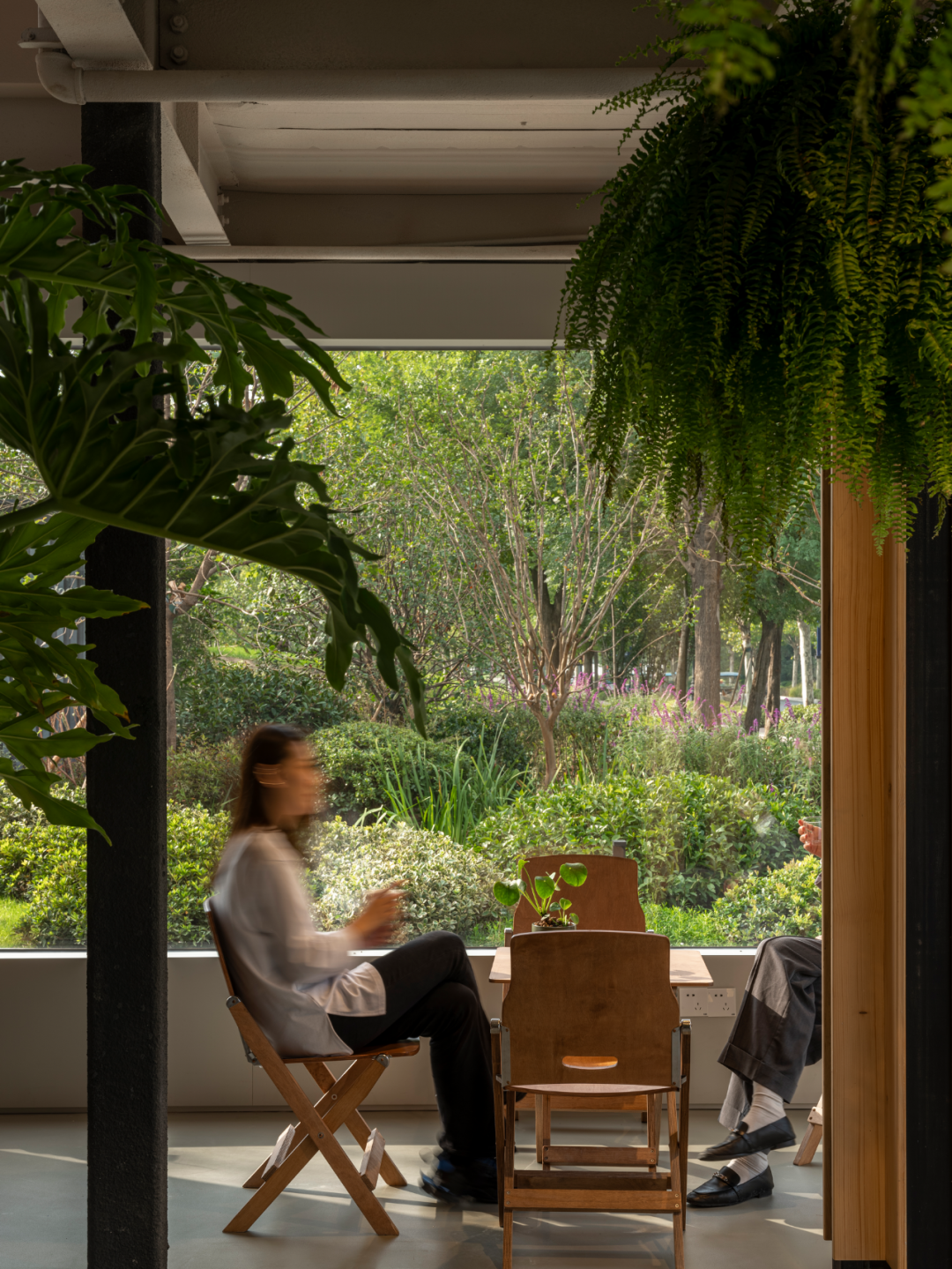 在市集的其他三个界面,则延续公园的林向气氛,将种植蔓延到了用地之外,借此架构出植物错落的景深,摈除工地画面的影响,营造出当下的自然沉浸式体验。