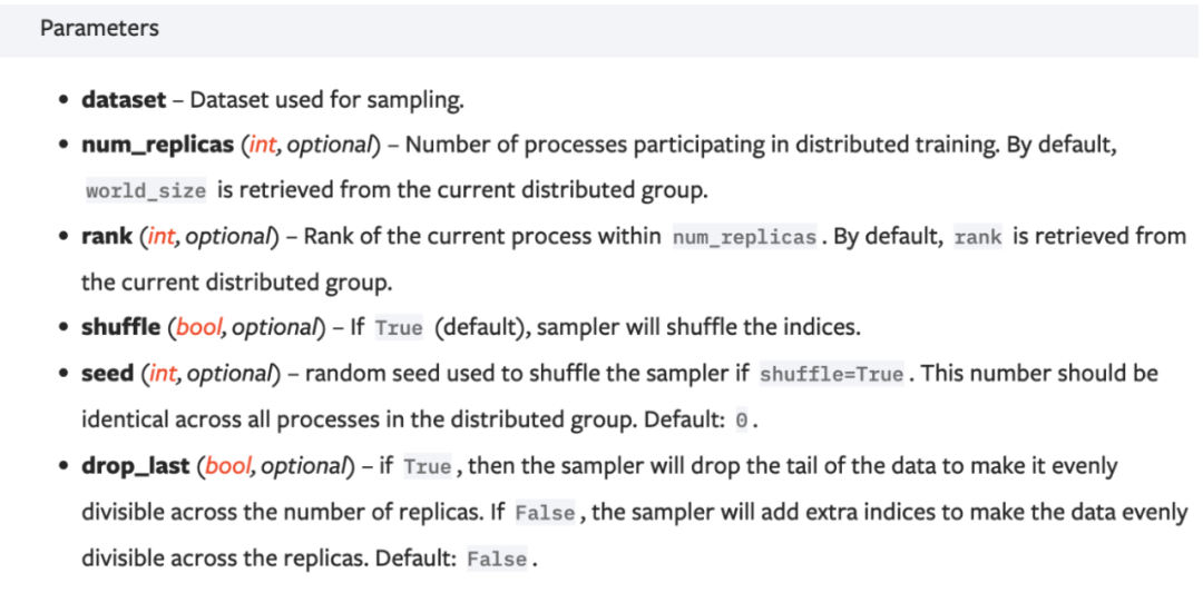 from torch import distributed as distfrom torch.utils.data.distributed import DistributedSamplerimport torch.utils.data as Dataassert torch.cuda.is_available()if not dist.is_initialized():dist.init_process_group(backend='nccl')rank = dist.get_rank()world_size = dist.get_world_size()model = MyModel().cuda()ddp_model = DistributedDataParallel(model, device_ids=[torch.cuda.current_device()]).cuda()dataset = MyDataset()sampler = DistributedSampler(dataset, rank, world_size, shuffle=True)dataloader = Data.DataLoader(dataset, batch_size, drop_last=False, sampler=sampler, shuffle=False, num_workers=8, pin_memory=True)# training