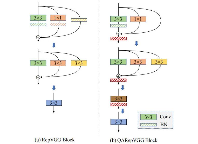 性能与推理速度间的均衡在实际应用中非常重要,而结构重参数机制是达成该均衡的一种非常有效的模块。但是,因结构重参数训练得到的模型在面临量化时却出现了严重的性能下降(比如RepVGG-A0经PTQ量化,指标从72.4%下降到了52.2%)。