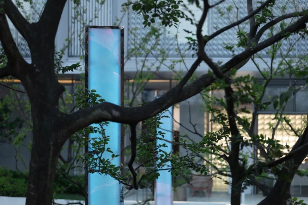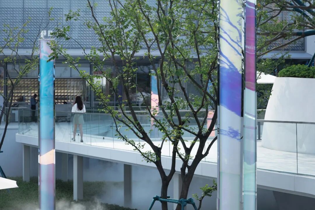 借助10根5.5m高的“幻彩棱柱”玻璃装置散落在下沉空间的不同角落,引导视线的延伸,加强上下层空间的联系。它可以和人互动,也可以和环境互动。棱镜用独特的视角和细长的取景框把蓝天、云朵、树木、泉水等现实环境收藏在一个极小的场景里,被色彩滤镜模糊幻化。随着时间的推移,与现实世界同步变化。