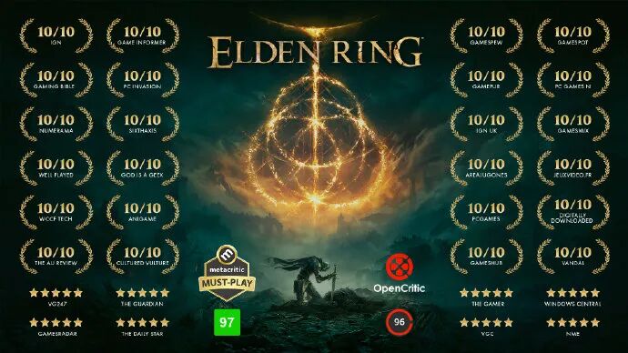 《艾尔登法环》全球媒体评分解禁后,多家媒体都给了老头环满分,FS官方也放出一张全是(10/10)满分的媒体赞誉图。