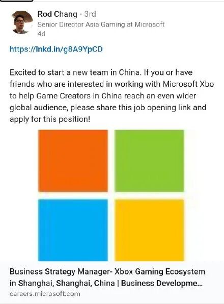 Rod Chang 的领英页面显示:“自己正在中国组建新的团队,如果你或者你的朋友有兴趣加入微软xbox去帮助中国的开发者获得更多的全球范围内的用户,请戳……”