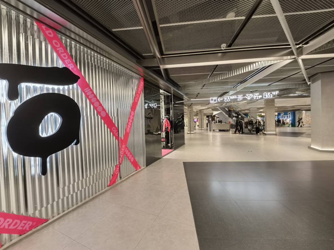 COSMO是一个改造项目,以“青年磁场”和“众在参与”的全新定位再度出发,为年轻人提供一个新的社交场。项目有别于传统高端商业综合体,没有刻意塑造的、有距离感的精致和浓重的理性色泽带来的重奢质感。门前蓝色卡通雕塑“谁动了我的胡萝卜”,以及门头“众在参与”的喷绘,以一种俏皮得当的方式展现年轻人喜爱的个性姿态。商场工业风十足,大面积的黑白灰、横平竖直的流畅线条、粗粝裸露的钢筋水泥,兼具科幻元素的灯光设计与留白足够的空间,具有强烈未来感的赛博朋克之美。