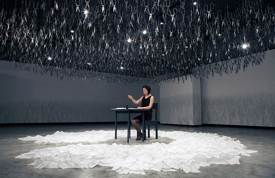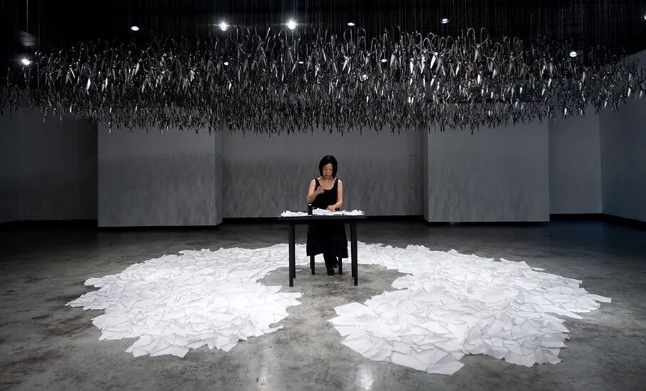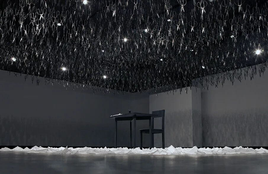 “The Mending Project(补缮工程)”是刘北立最具女性特质的作品之一,1500把中式剪刀以刀刃直指地面之势从天花板上悬落下来,形成一片颇有声势并暗示恐惧与不安的乌云。