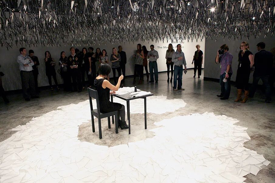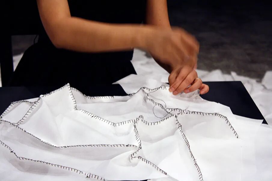 一个女人坐在无数锋利的剪刀刃下,正在执行一项简单的修补工作。观众被邀请剪下挂在画廊空间入口附近的小块白布,并将它们传递给表演者。缝制的织物布满黑色针迹的脊和谷,裸露在剪刀云下的地板上,并在整个表演过程中变大。锋利的剪刀与平和柔软的缝纫工作形成了强烈的视觉冲击。修补计划暗示迫在眉睫的侵略和不确定性,通过沉默、简单的修补行动来平衡和软化。