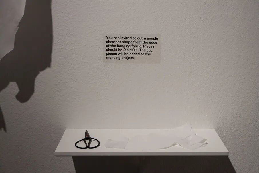 修补后的织物在整个表演过程中尺寸不断增大,并占据了剪刀下方的大面积地板。