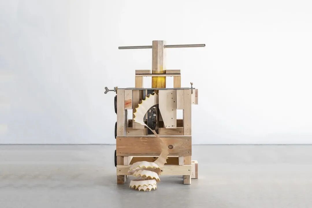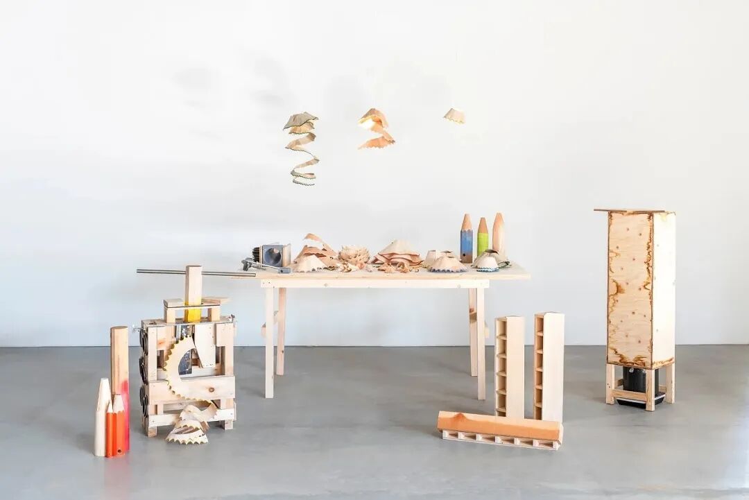 根据设计,Nanako Kume制作了这款巨大的卷笔刀,用来切削所需要的「铅笔屑」。为了防止铅笔屑易断的问题,Nanako Kume将木头提前进行了熏蒸,以保证削成薄片之后的韧性。
