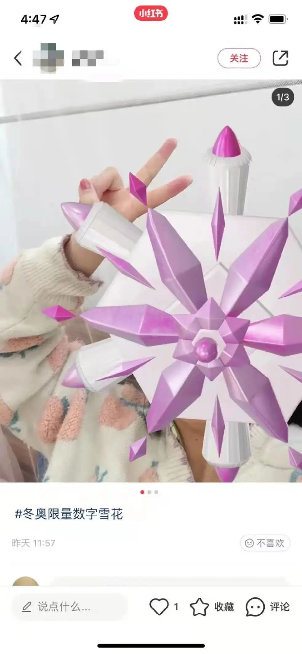一些互联网公司也开始参与其中,如小红书推出限量数字雪花活动,领取规则是做任务领碎片,集齐兑换成雪花NFT。截至目前,小红书#冬奥限量数字雪花#话题有着218.6万的浏览量。