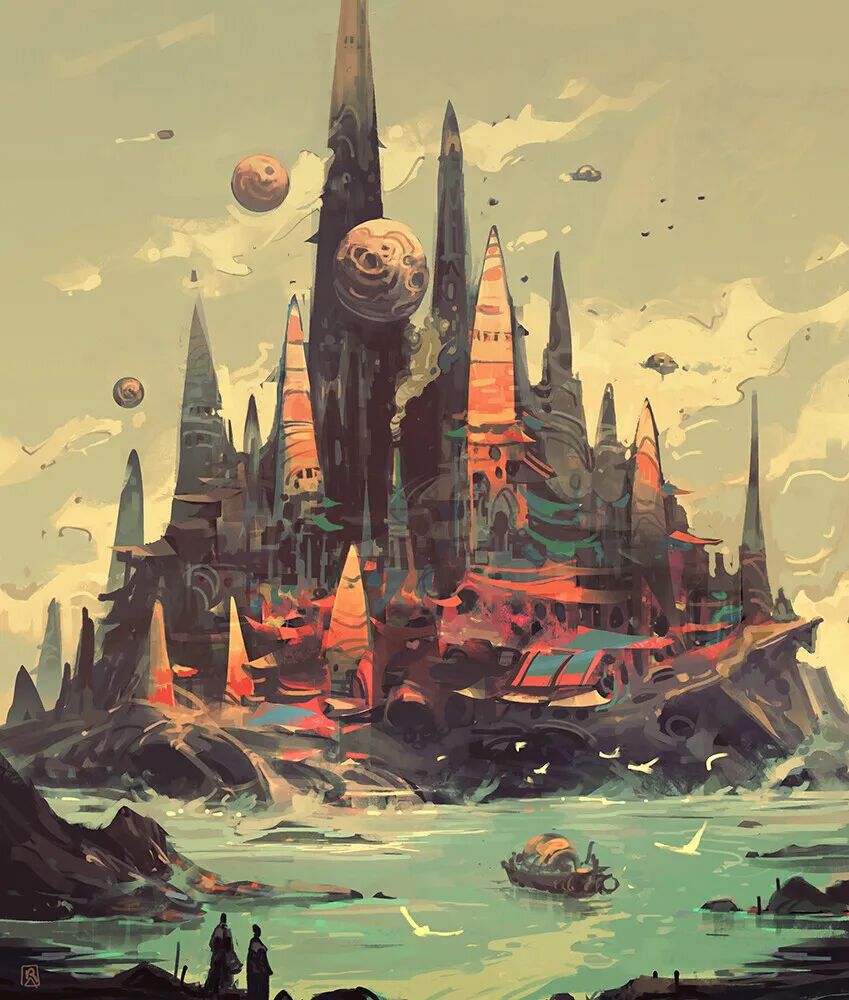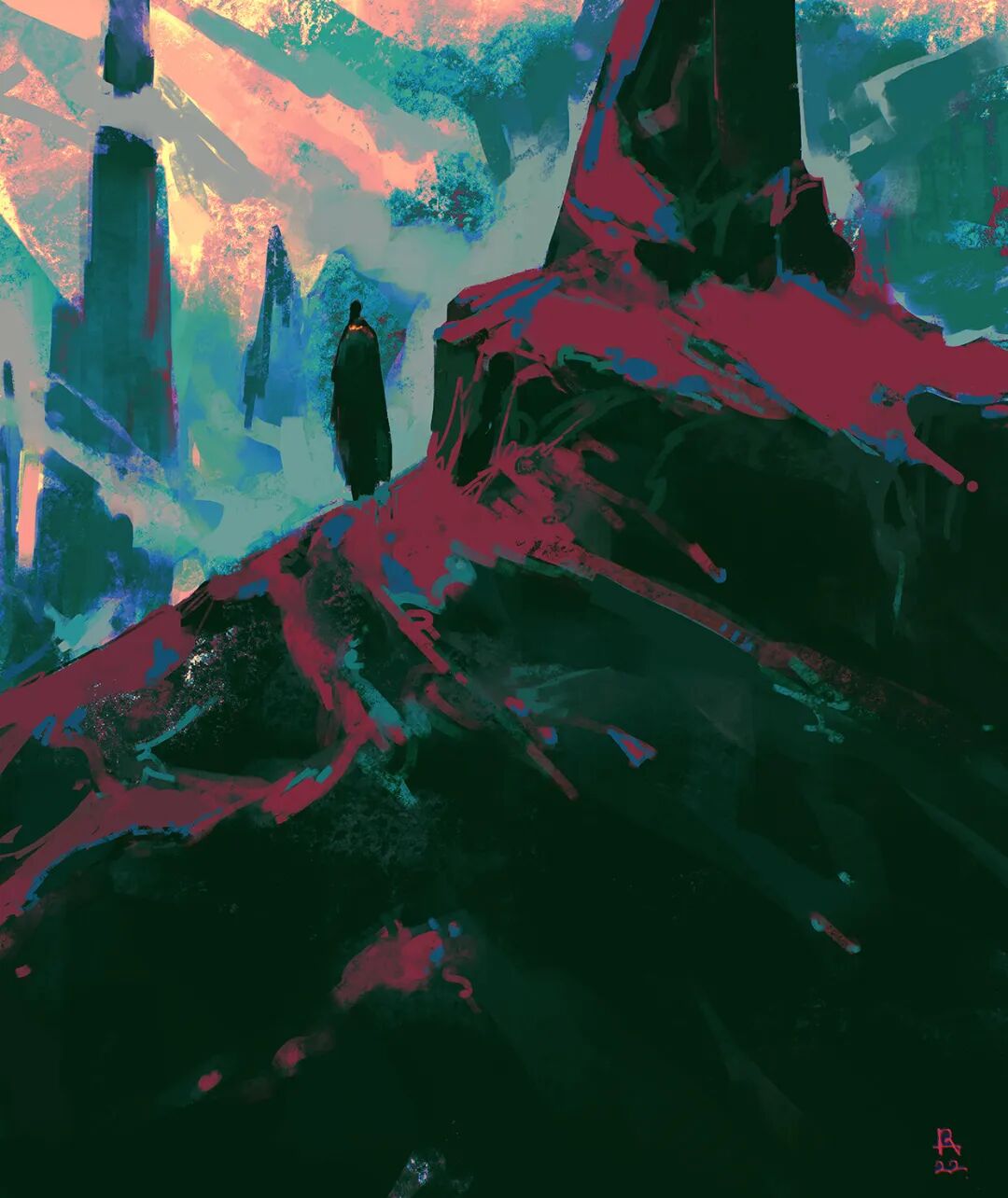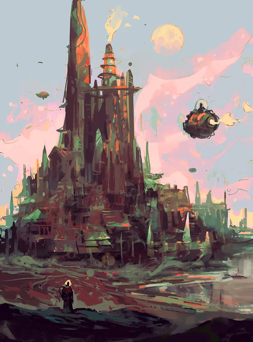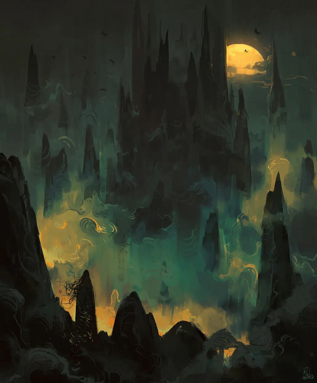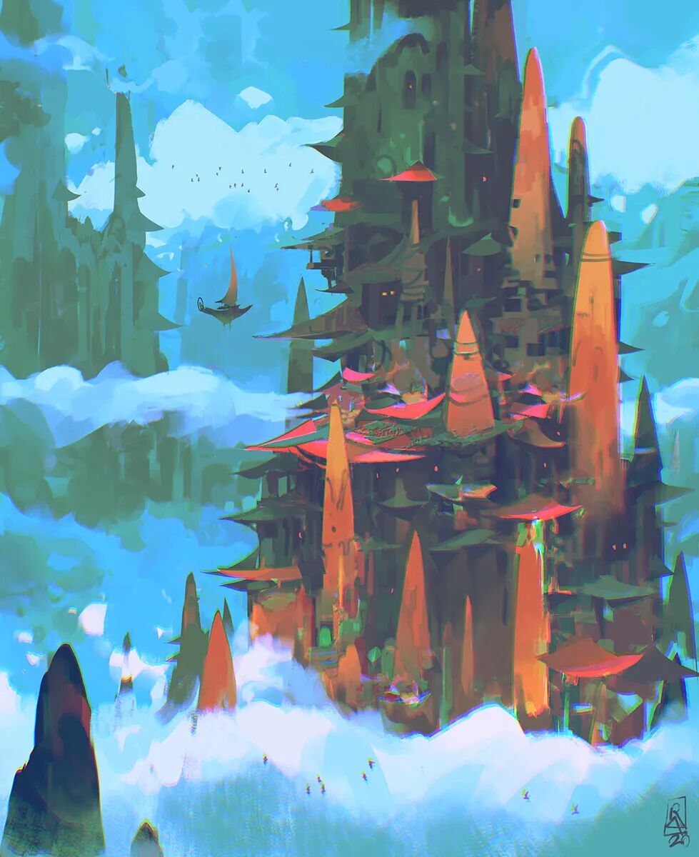 来自土耳其插画师、概念艺术家他的作品恢弘大气、奇幻瑰丽,空间塑造感强,生动的色彩和自然风光相结合,营造出史诗般的画面,氛围营造强者。