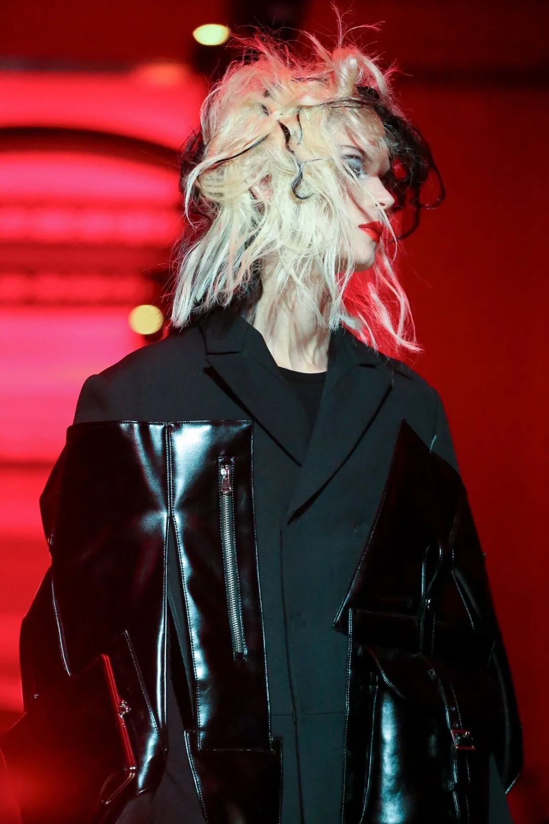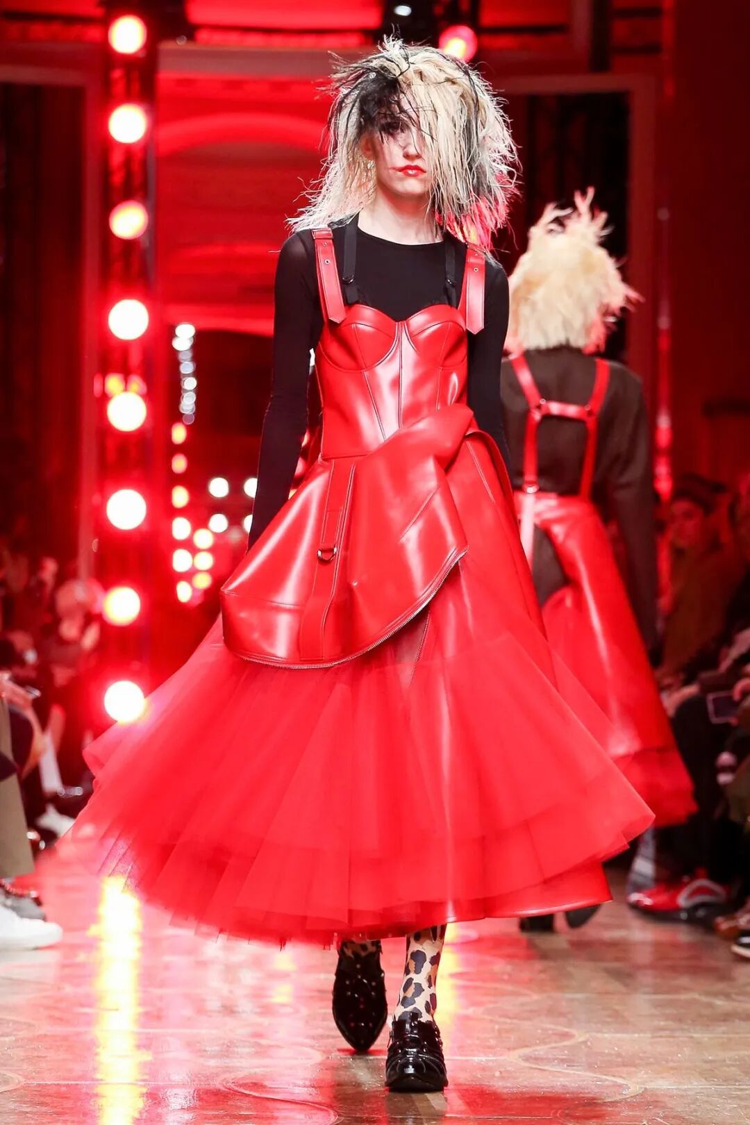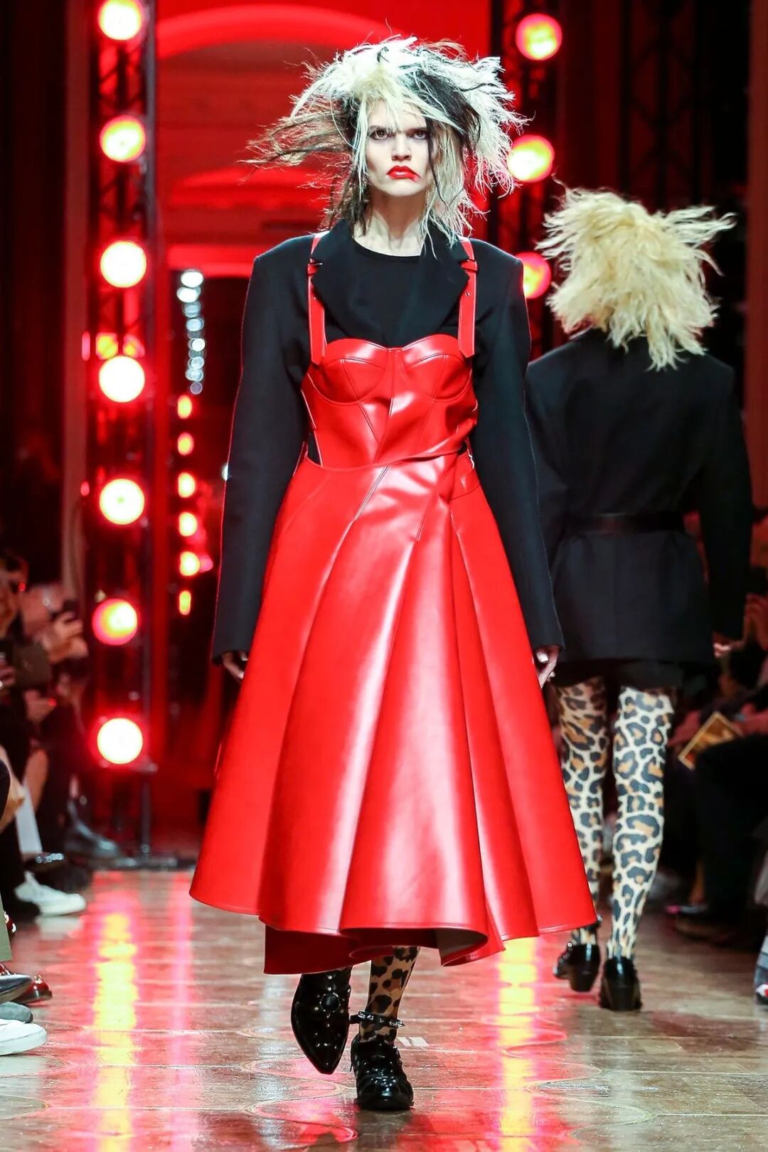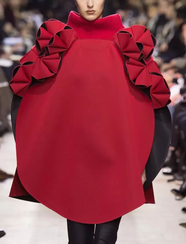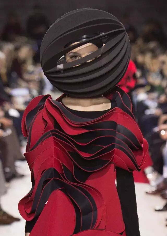 红与黑的极端色彩对比,巧妙的渲染了妖冶反叛的女性气质。渡边淳弥将看似矛盾对立的皮革与薄纱合二为一,以破坏性的不对称式组合打破了对于性感女性的枯燥定义,通过颠覆性的两极糅合展现了他眼中强势而狂野的女性之美。