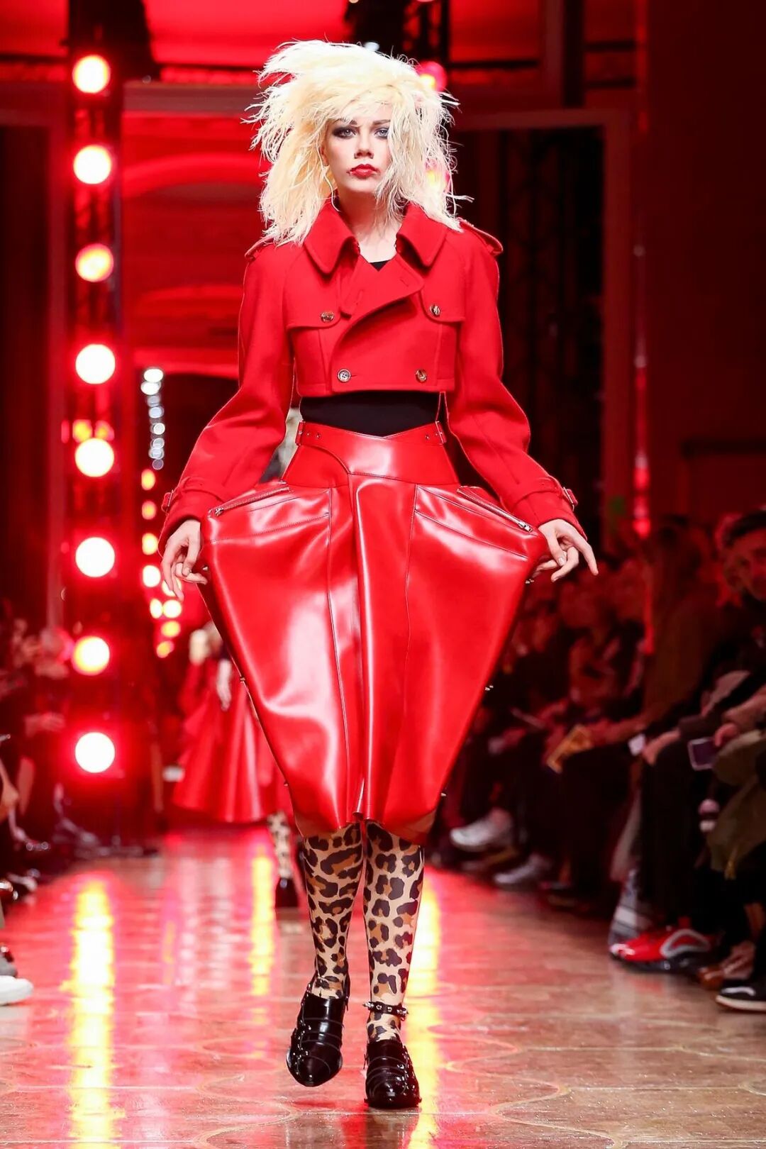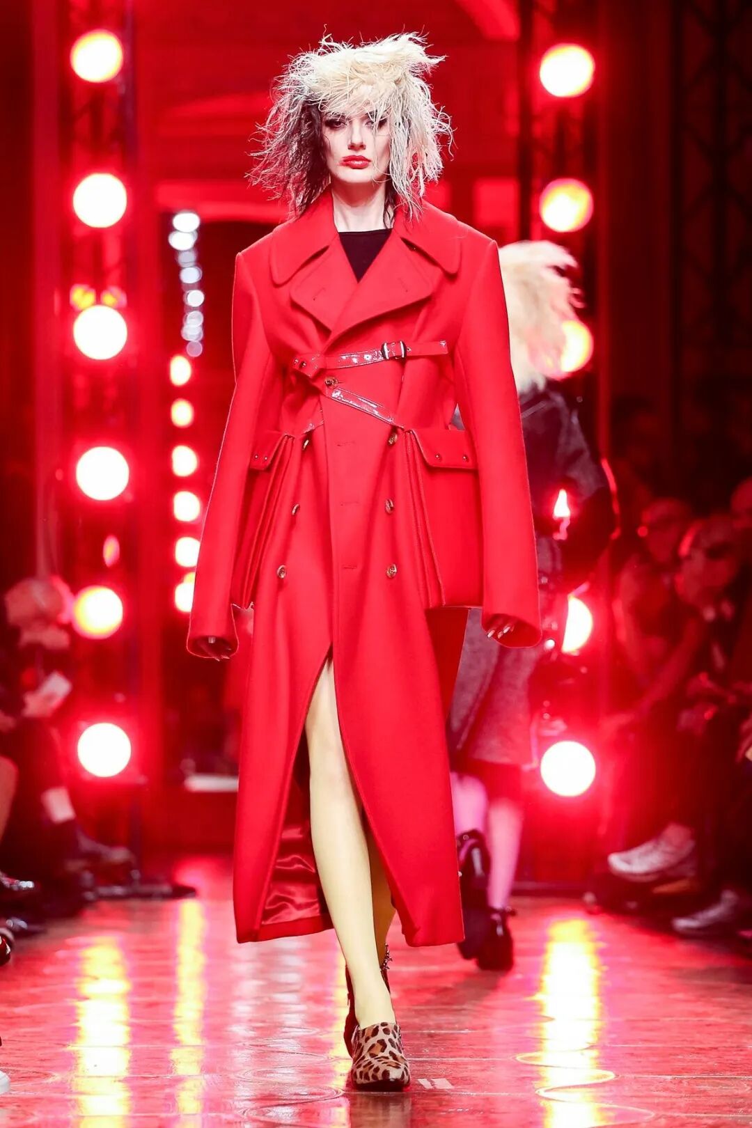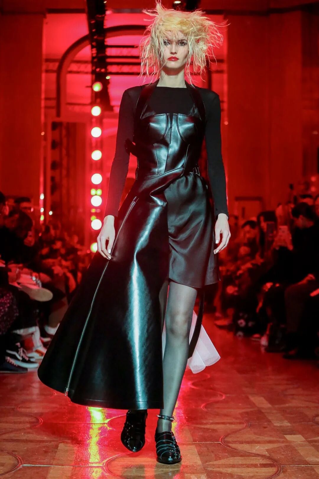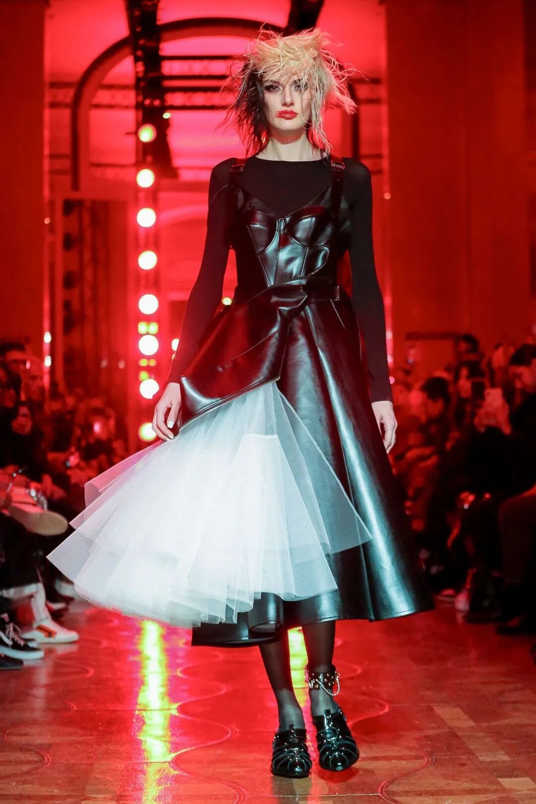 红与黑的极端色彩对比,巧妙的渲染了妖冶反叛的女性气质。渡边淳弥将看似矛盾对立的皮革与薄纱合二为一,以破坏性的不对称式组合打破了对于性感女性的枯燥定义,通过颠覆性的两极糅合展现了他眼中强势而狂野的女性之美。