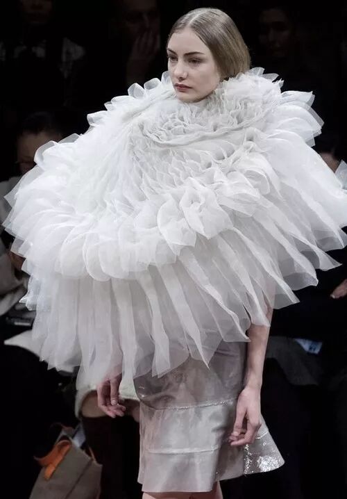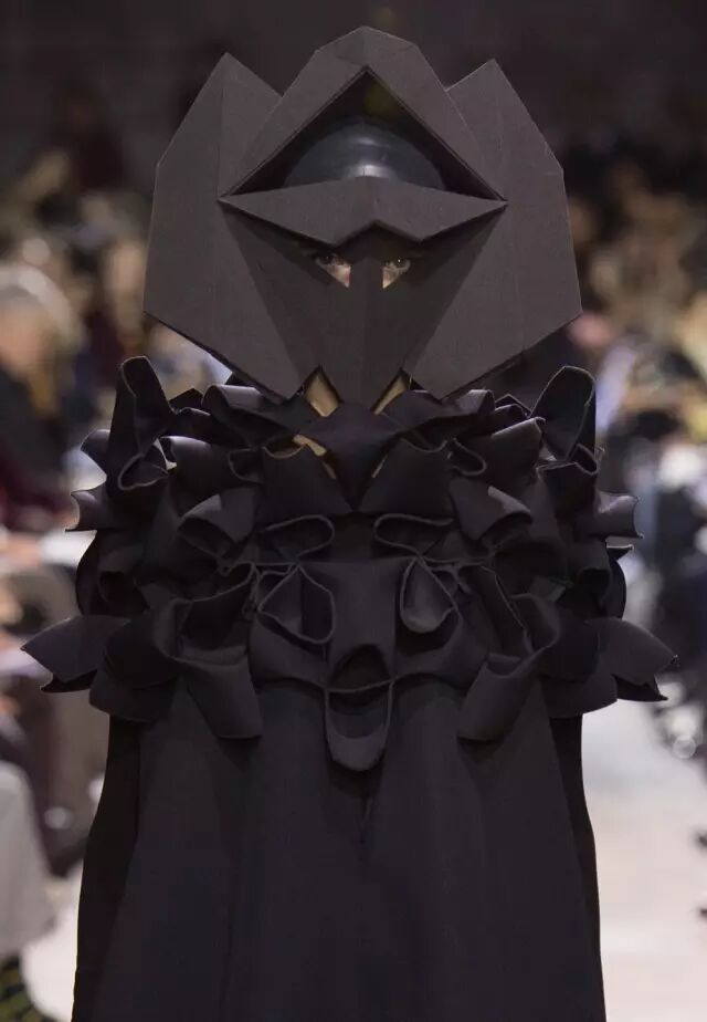 正如前文所说,在本季我们依旧可以一窥渡边淳弥创新求变的设计思路。对于传统西服夹克、紧身胸衣裙装结构的拆解和层次丰富的面料材质搭配化作了本场创作的主旋律。