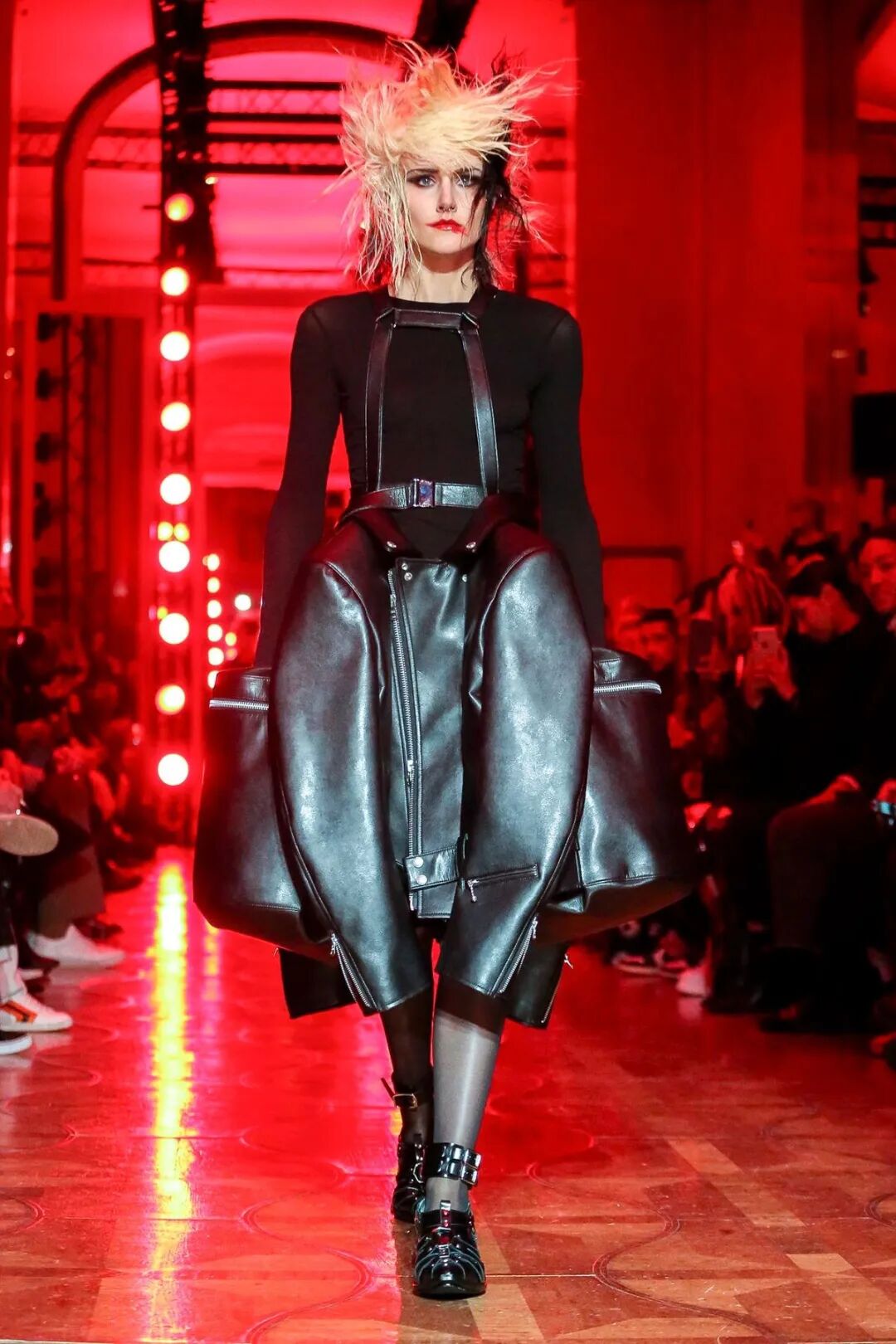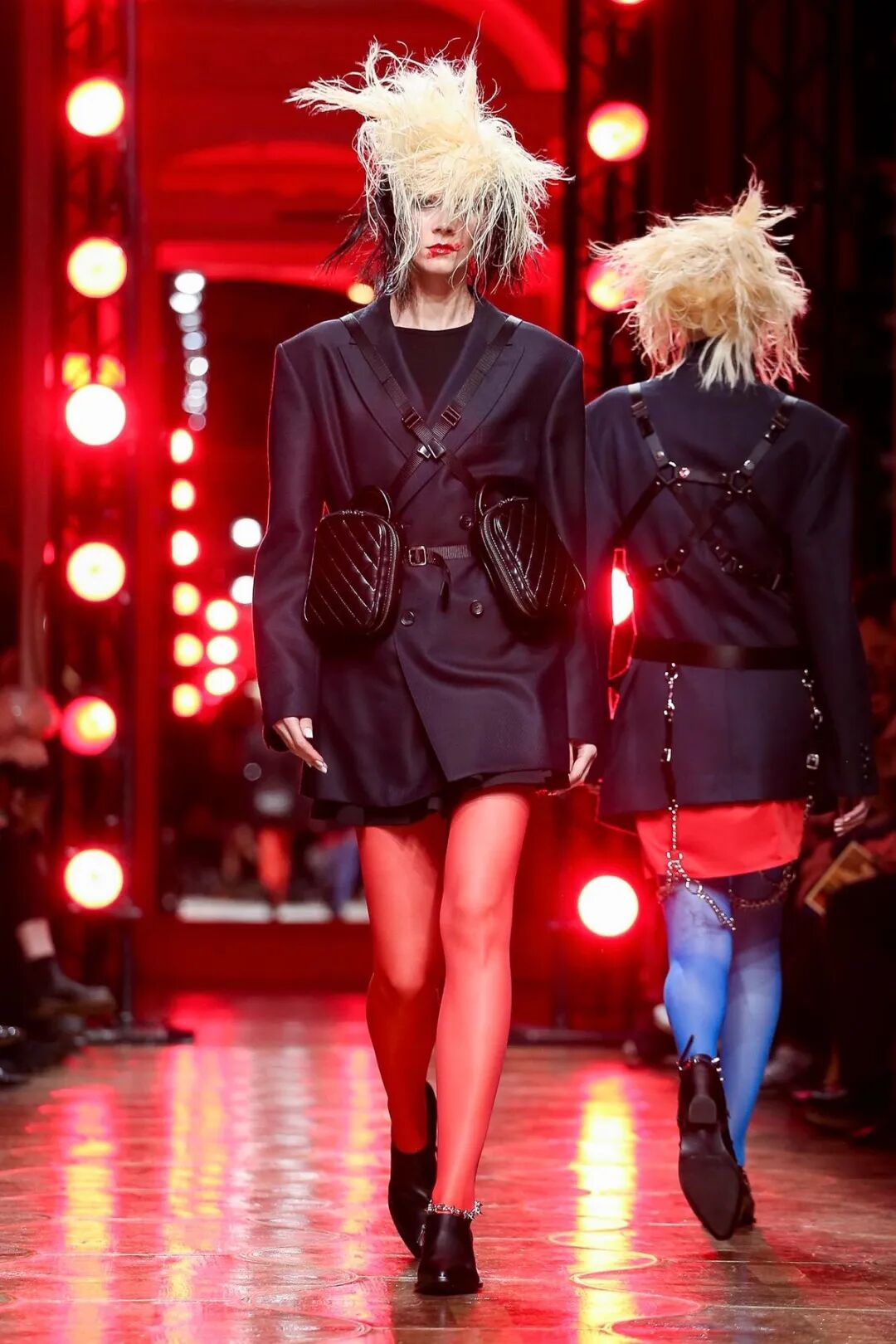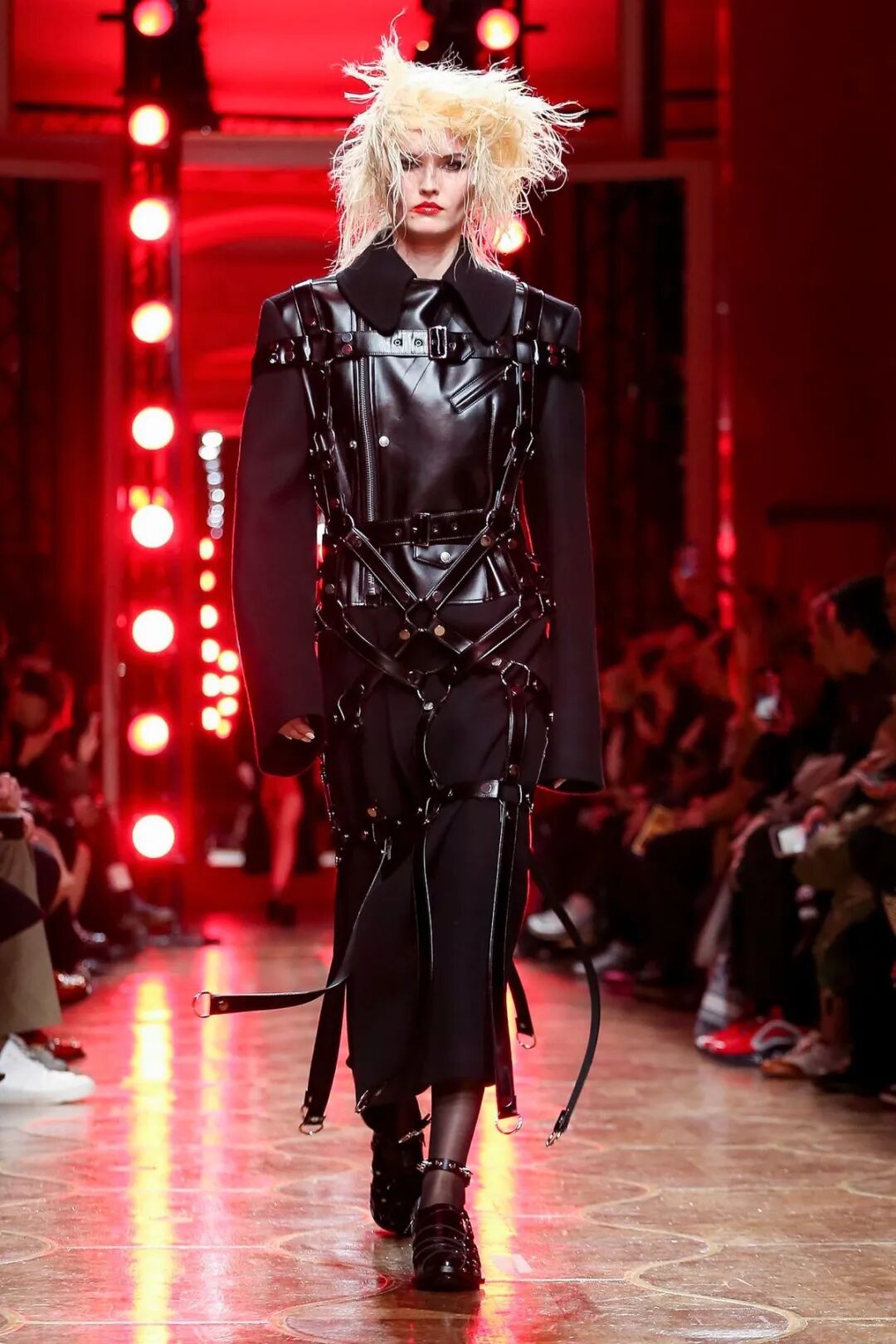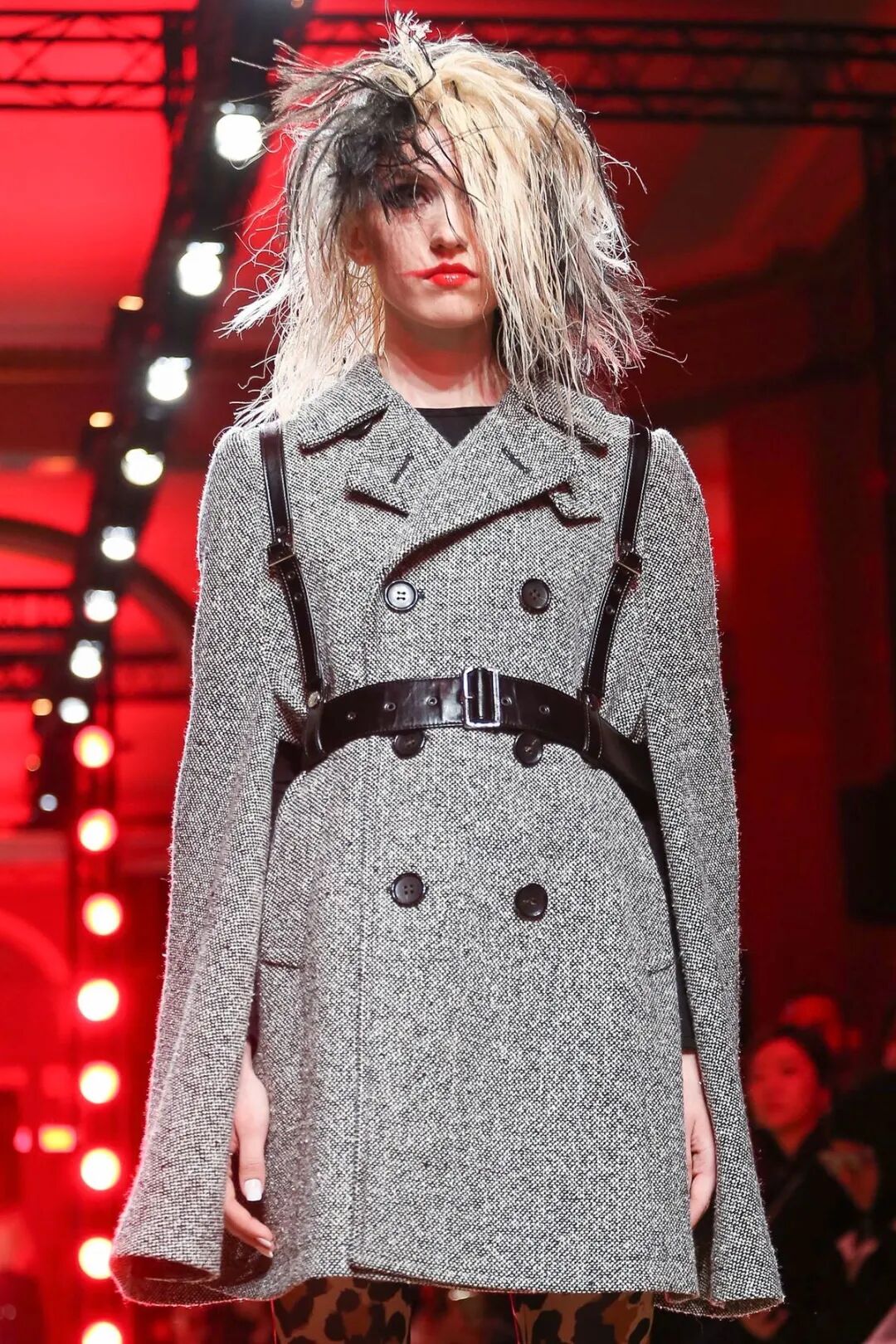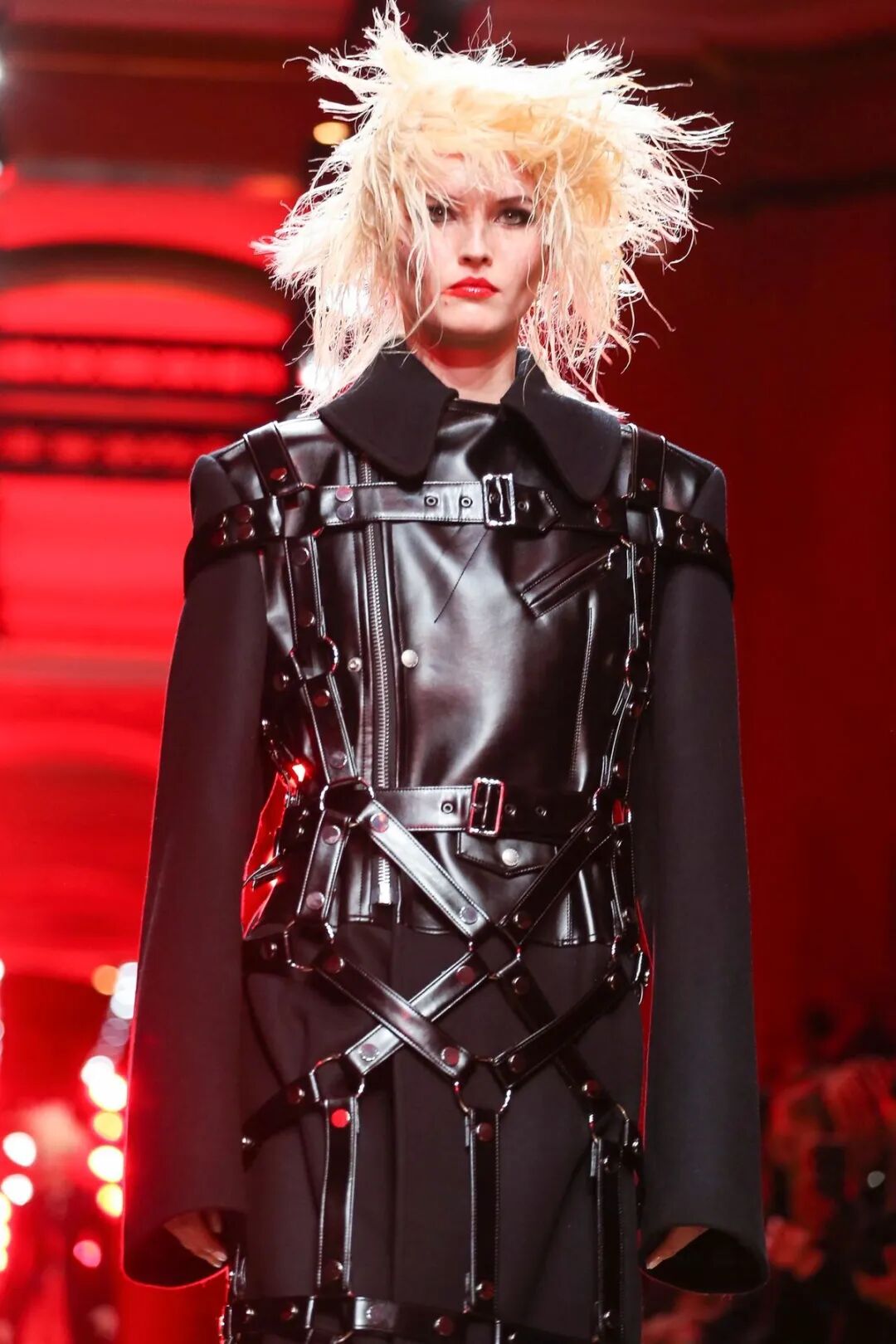 皮革铆钉、束带等充斥着性暗示的街头朋克元素,与高级时装解构廓形之间的融合制造了独特的视觉吸引力。关于这一点,渡边淳弥早有预示,他曾如是说道:"结构廓形和街头风格在造型上并不是完全对立的而是互补的。当它们融合在一起,风格会变得更强。"