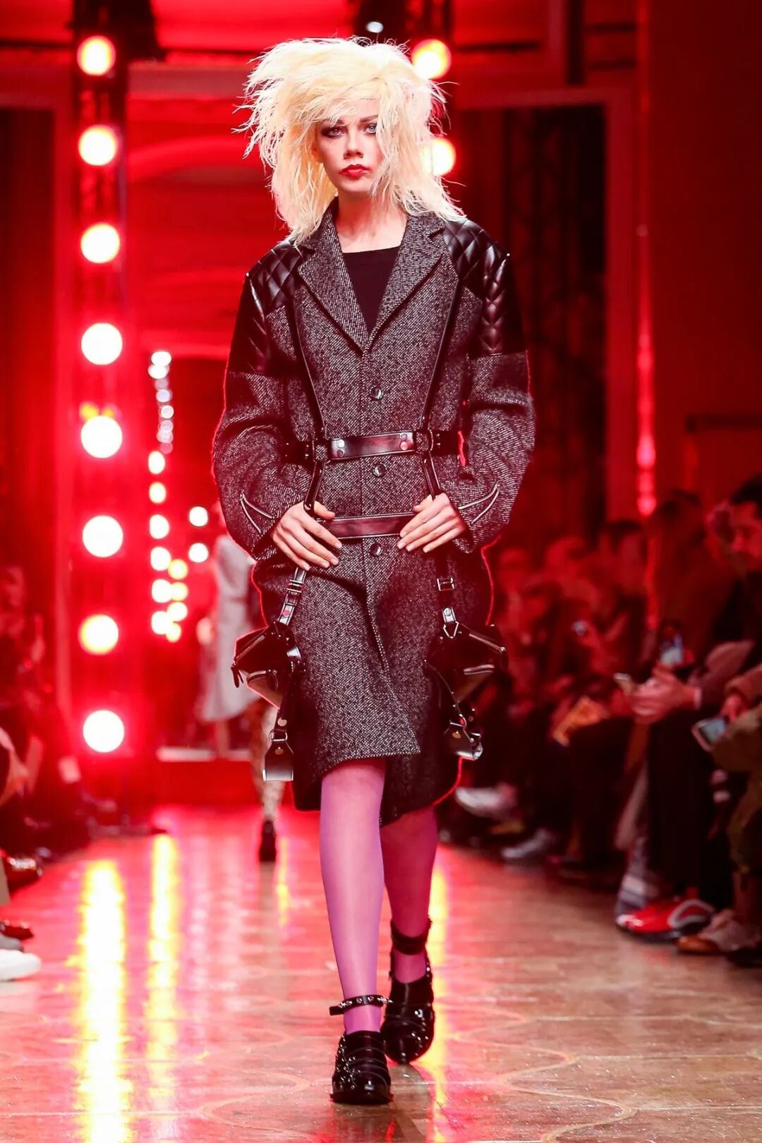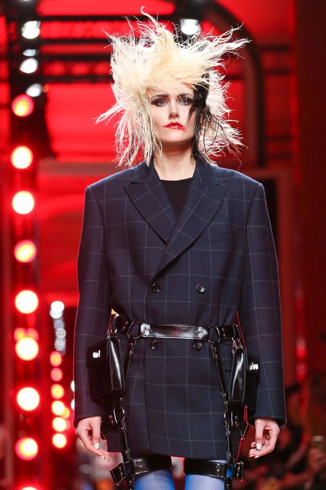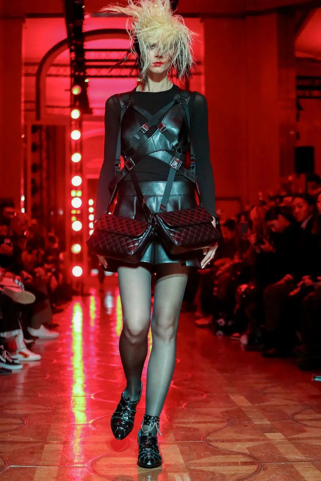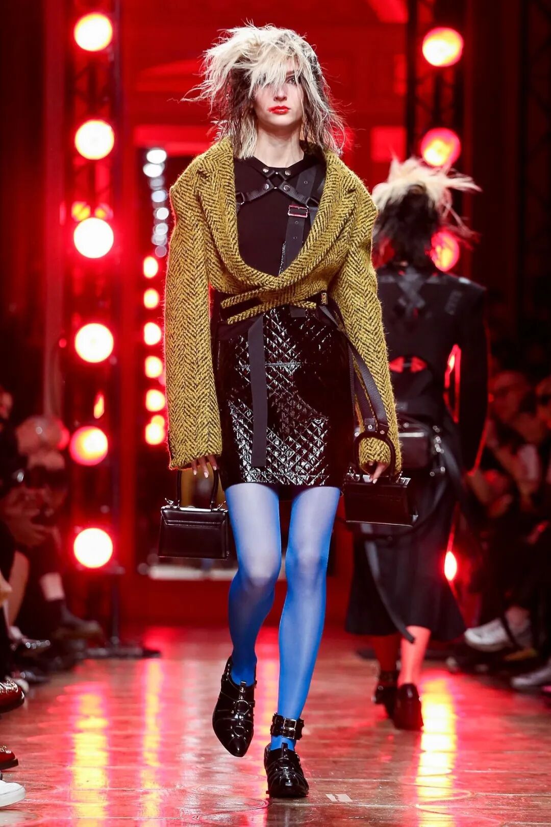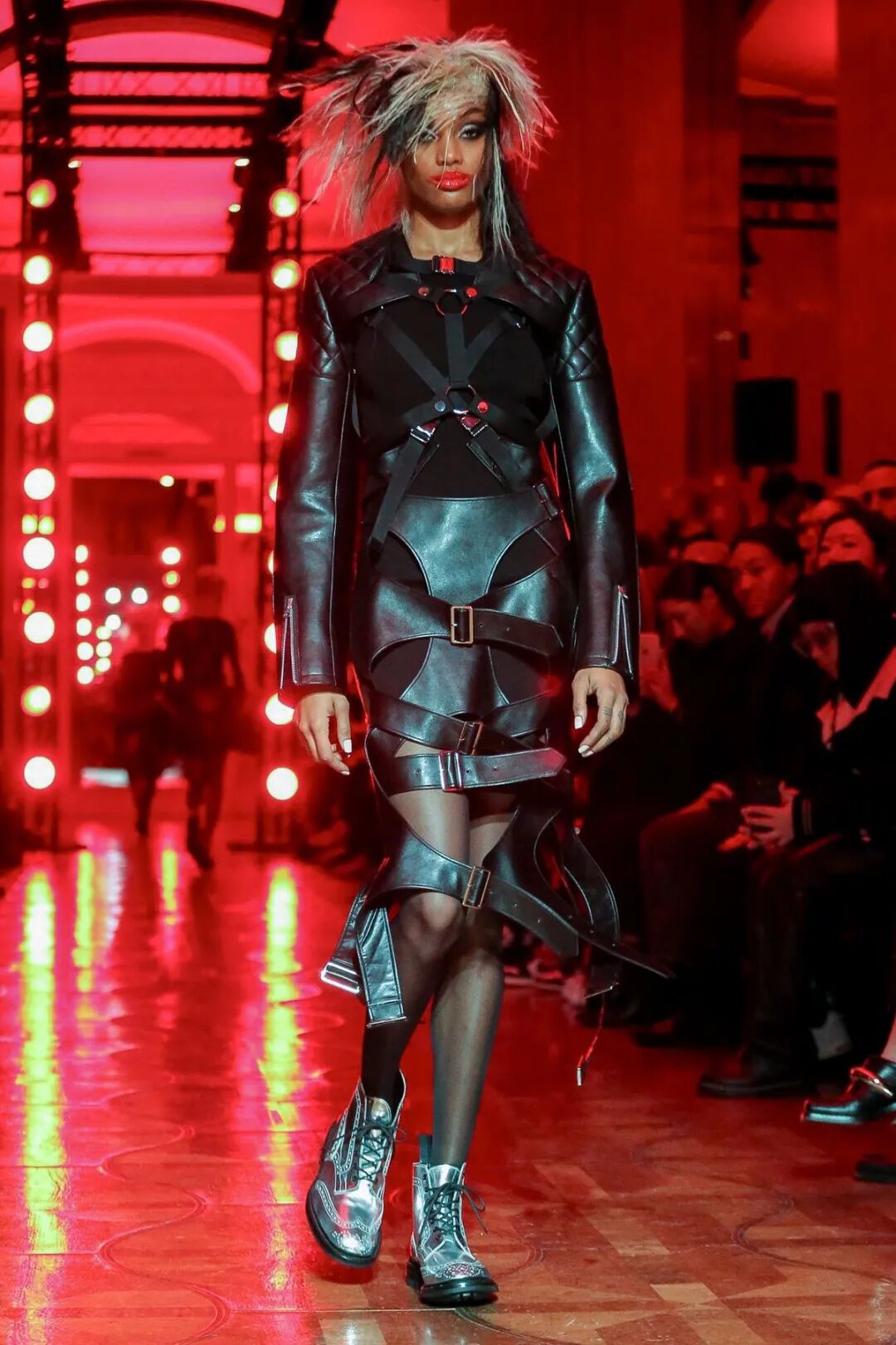 皮革铆钉、束带等充斥着性暗示的街头朋克元素,与高级时装解构廓形之间的融合制造了独特的视觉吸引力。关于这一点,渡边淳弥早有预示,他曾如是说道:"结构廓形和街头风格在造型上并不是完全对立的而是互补的。当它们融合在一起,风格会变得更强。"