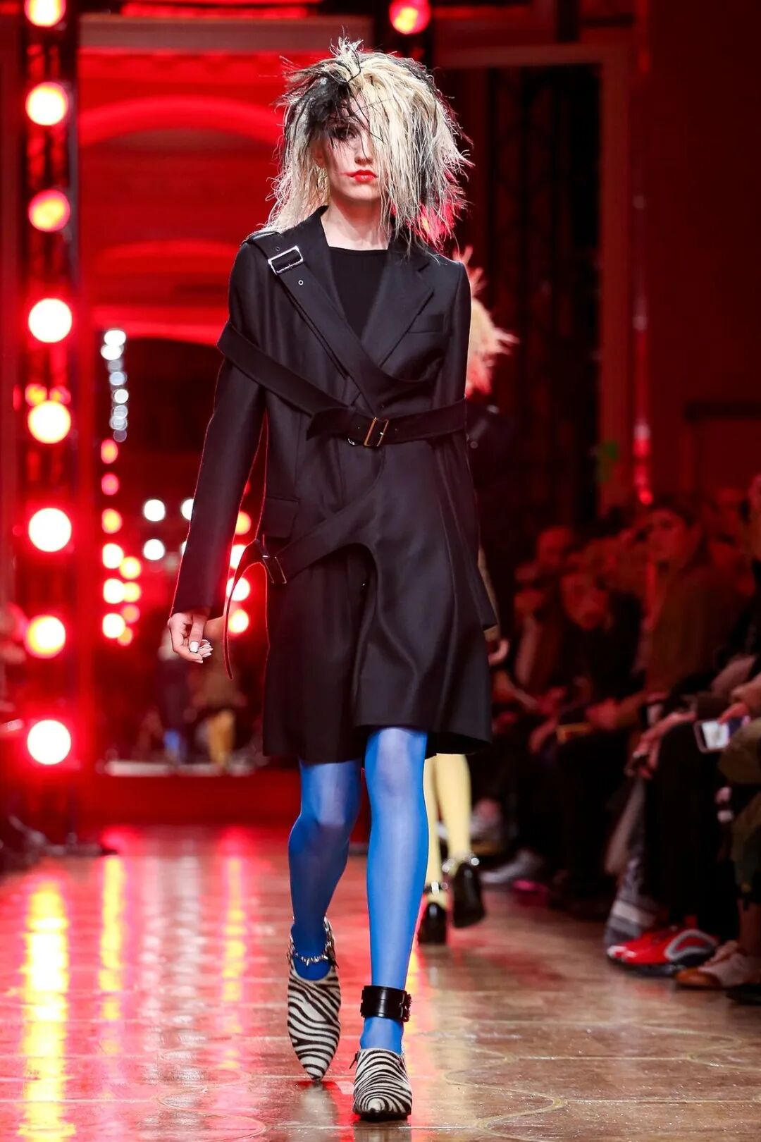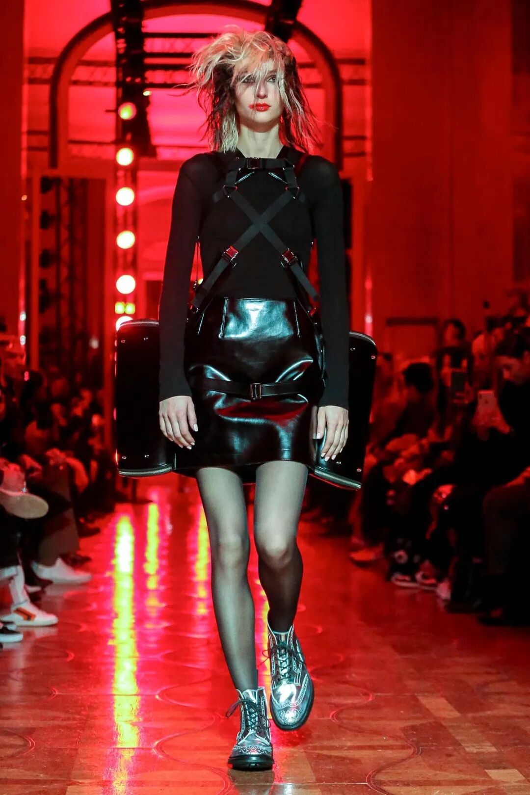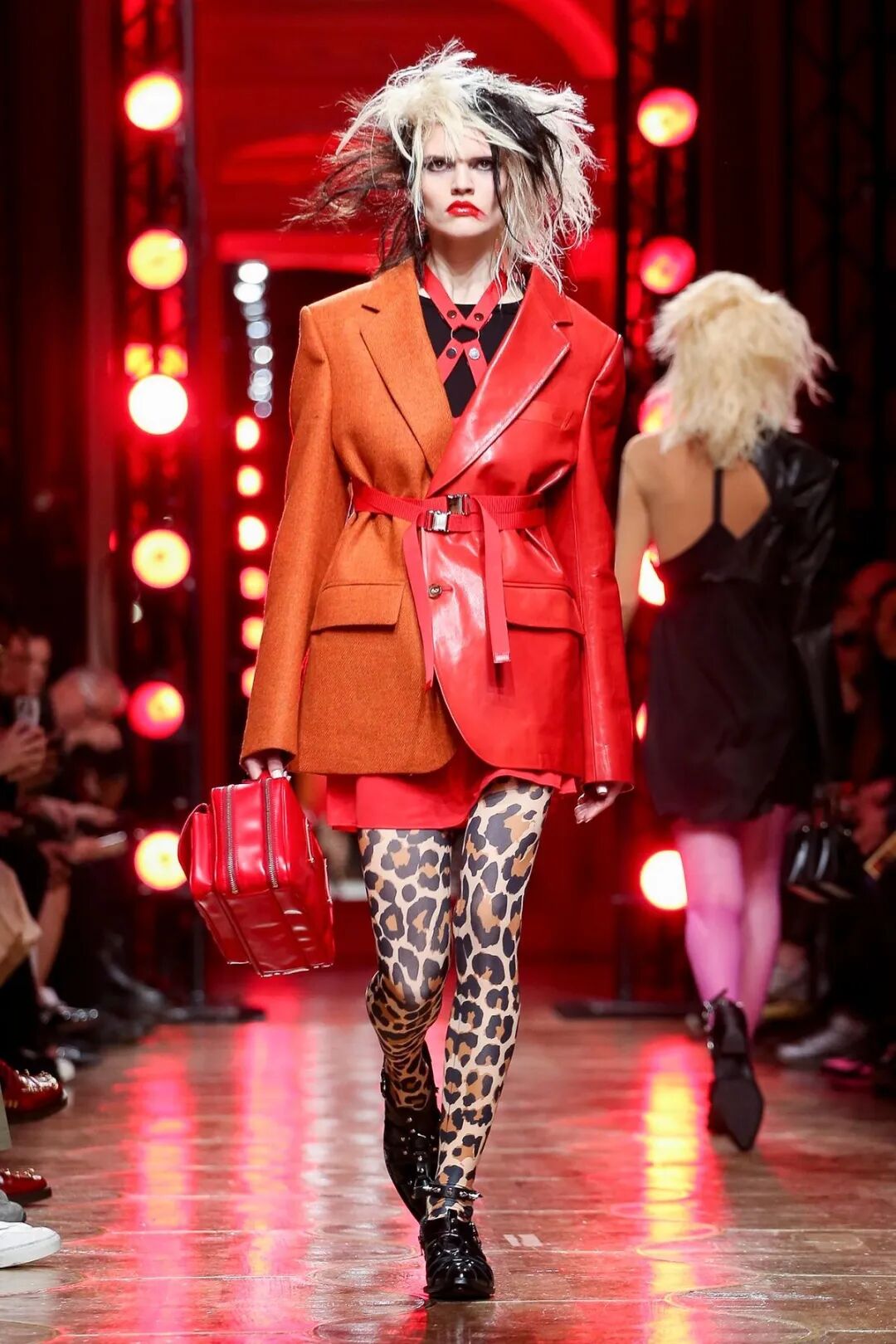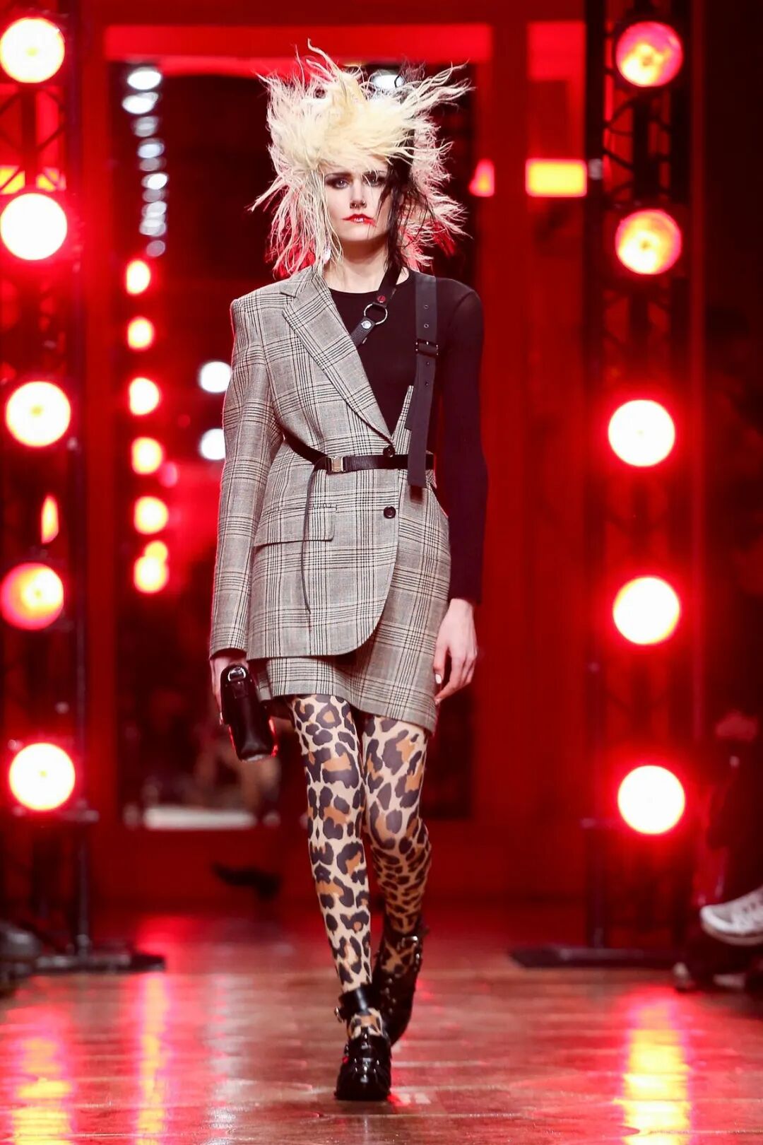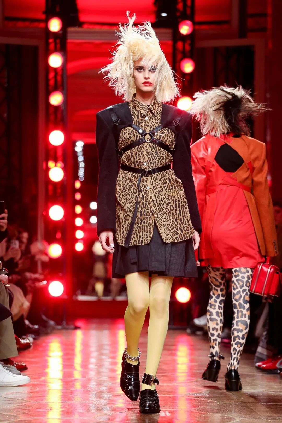 皮革铆钉、束带等充斥着性暗示的街头朋克元素,与高级时装解构廓形之间的融合制造了独特的视觉吸引力。关于这一点,渡边淳弥早有预示,他曾如是说道:"结构廓形和街头风格在造型上并不是完全对立的而是互补的。当它们融合在一起,风格会变得更强。"