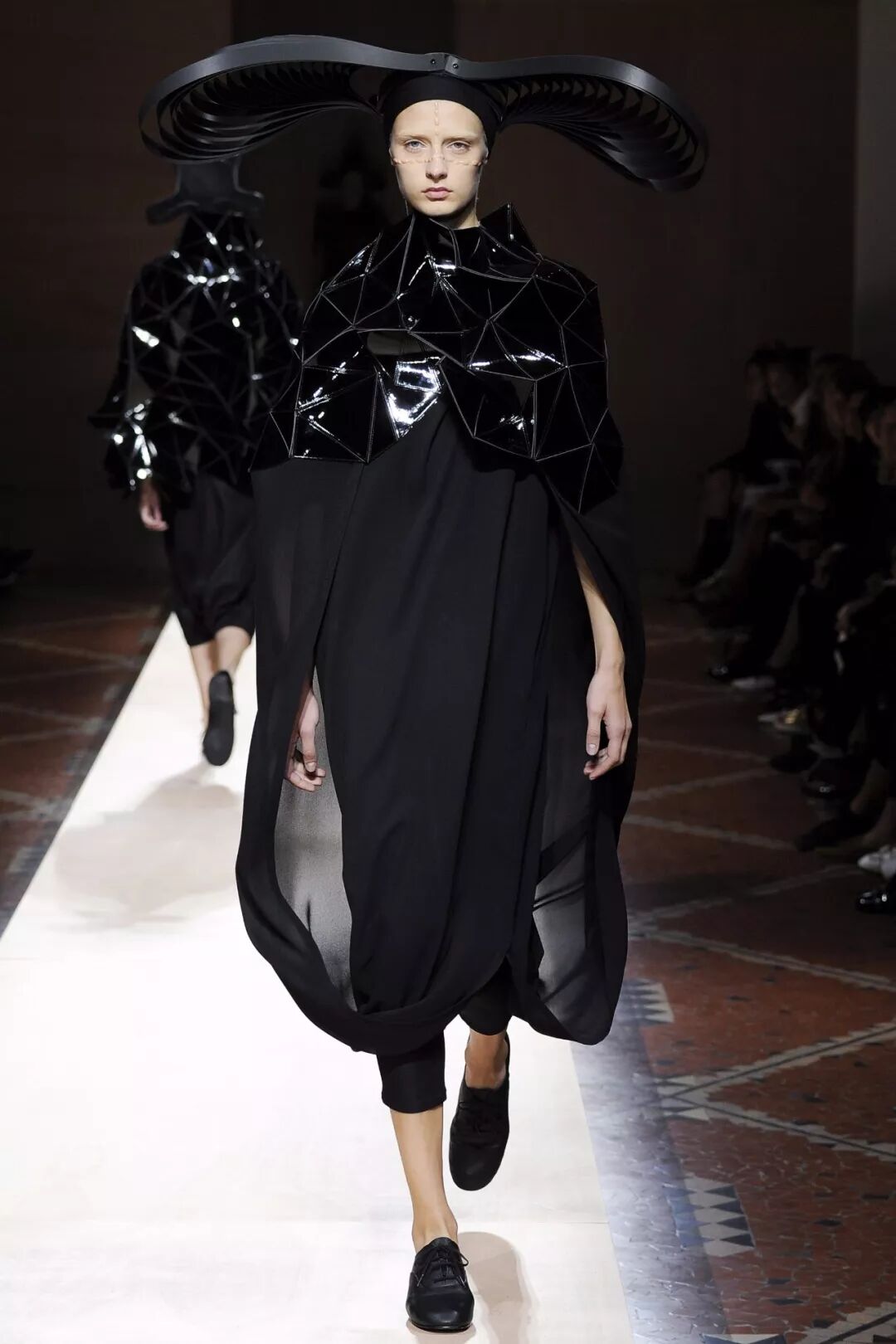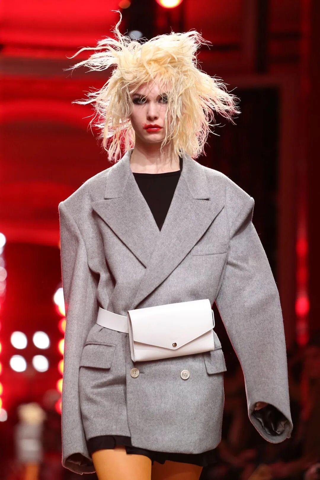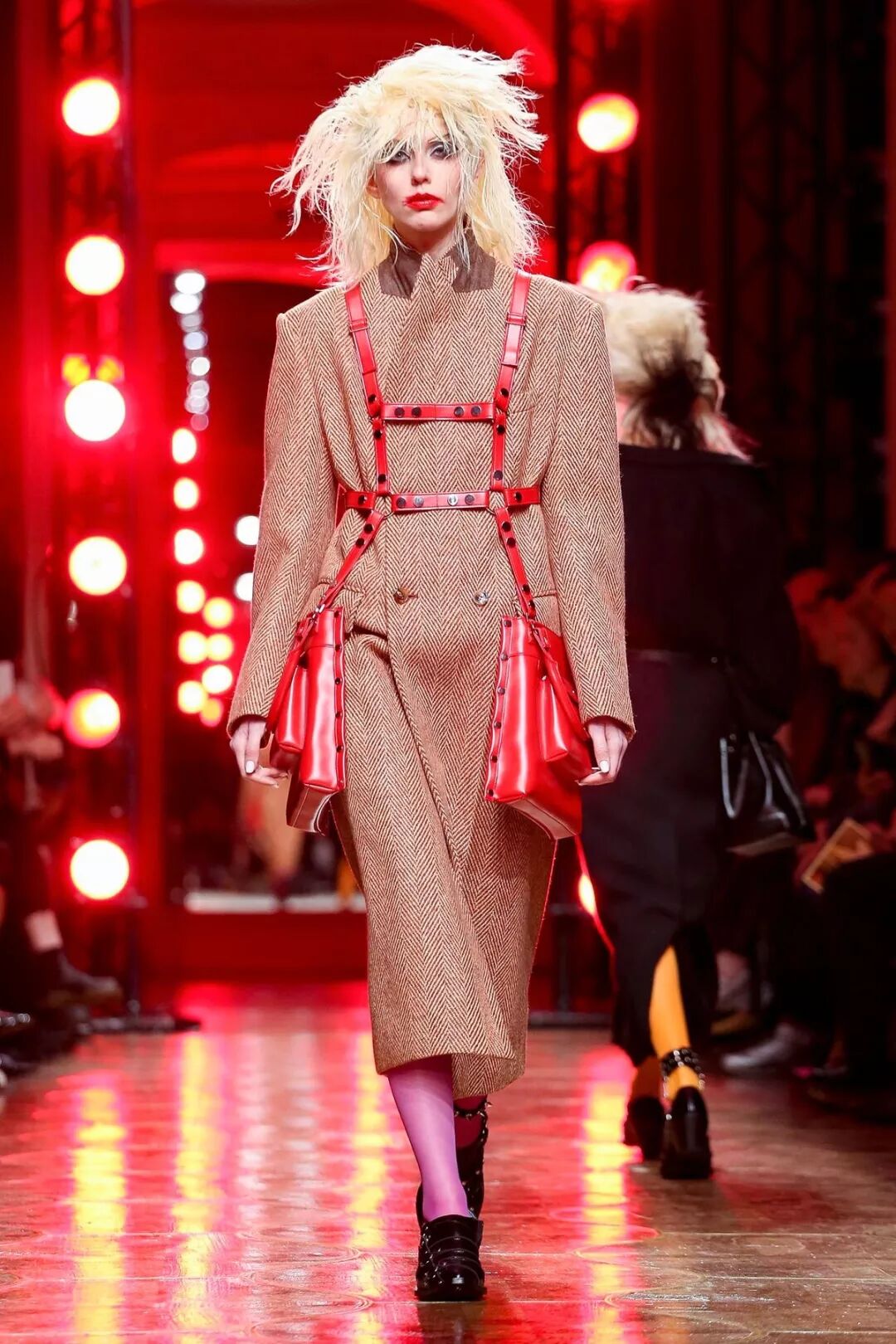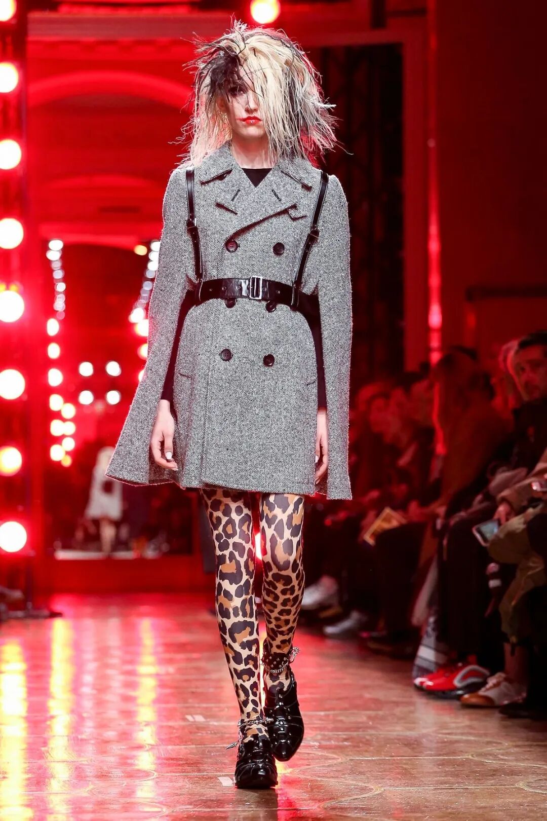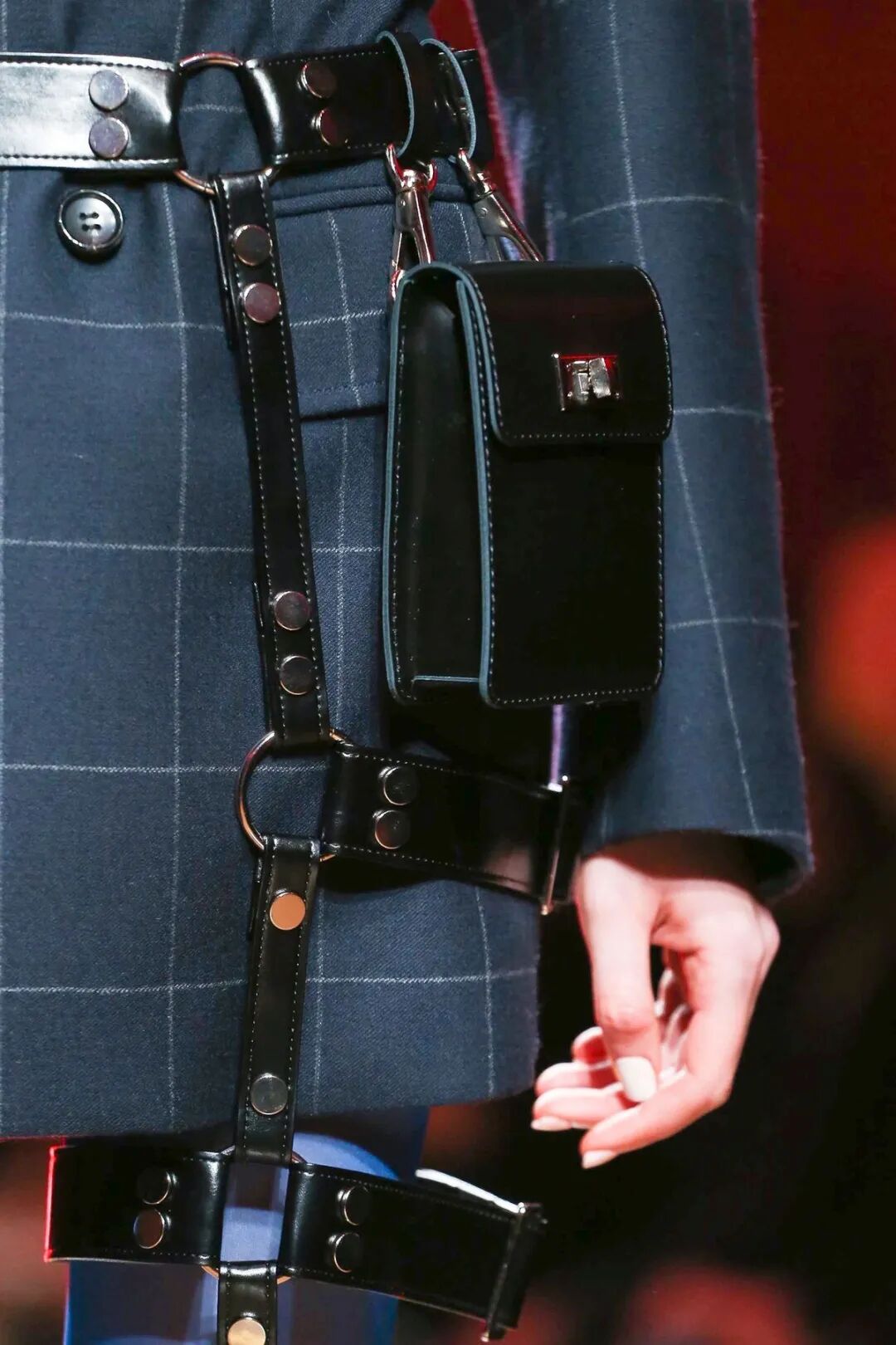 皮革铆钉、束带等充斥着性暗示的街头朋克元素,与高级时装解构廓形之间的融合制造了独特的视觉吸引力。关于这一点,渡边淳弥早有预示,他曾如是说道:"结构廓形和街头风格在造型上并不是完全对立的而是互补的。当它们融合在一起,风格会变得更强。"