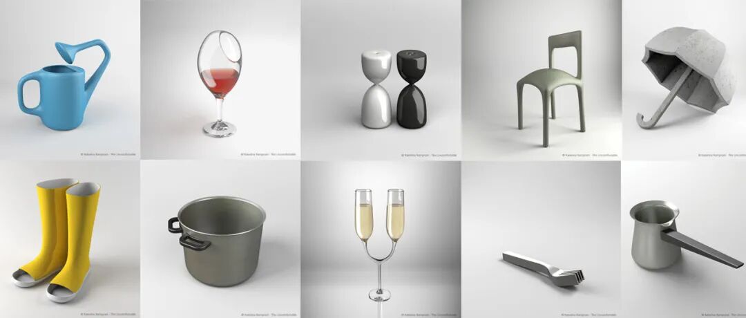 他将生活中的日常用品重新塑造,以合理但又不寻常的手法重新设计,进行建模、渲染、制作样板,制作成看似滑稽的产品,以此来抨击、讽刺当今社会下关于:死亡、战争、人际关系等方面的问题。