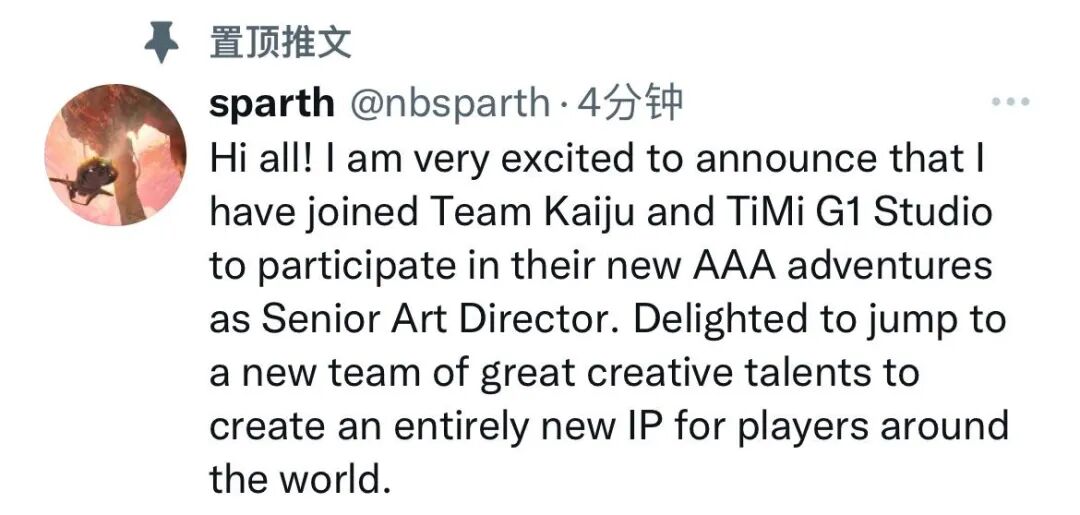 “我非常激动地宣布,我已经加入天美G1工作室的Team Kaiju,以高级美术总监的角色参与他们开发3A游戏,开启一段新的冒险。”布维尔写道,“我很高兴有机会加入一支优秀人才组建的新团队,为世界各地的玩家创作全新的IP。”