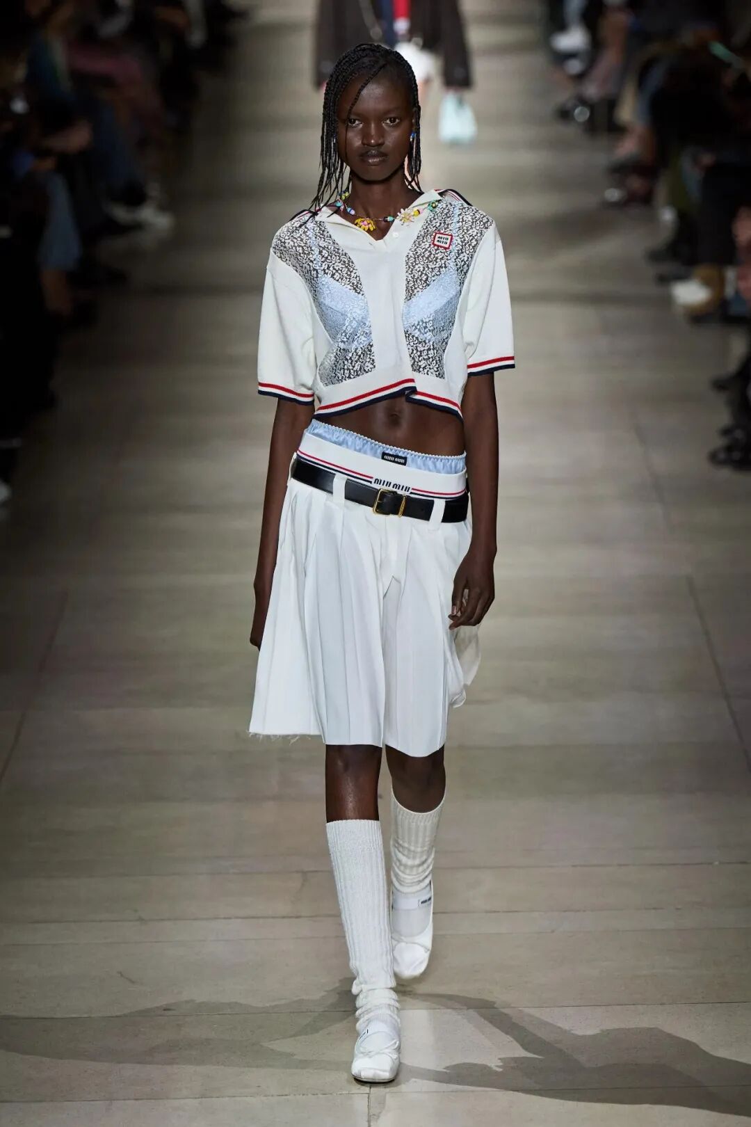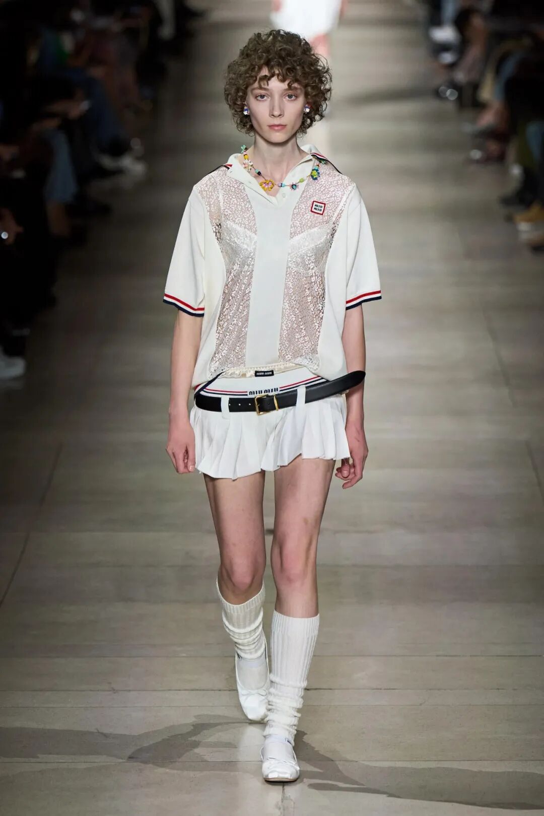 Miu Miu女孩在上一季打乱了陈旧的办公室着装规范之后,她们把目光投向了网球场,超短超低的Y2K裙装混搭着芭蕾舞鞋和针织袜。活泼可爱的复古学院MiuMiu少女正在向你走来。